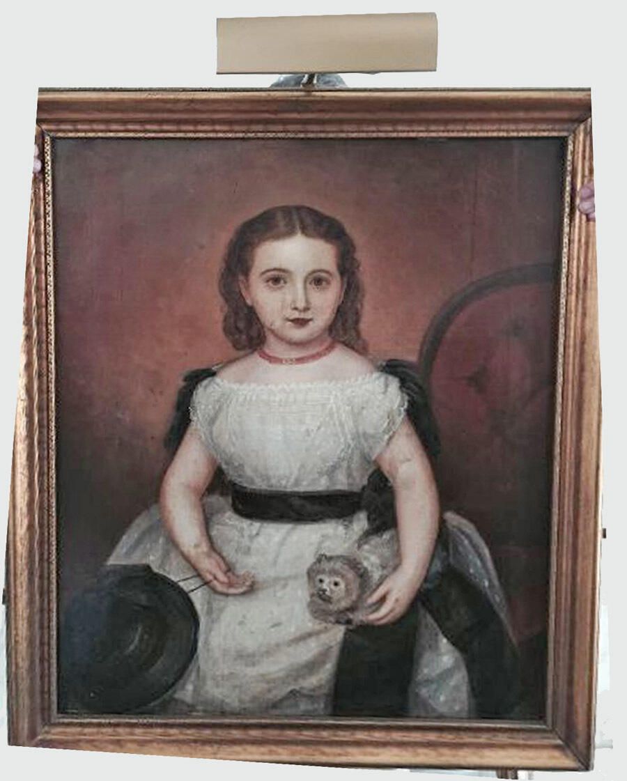 Early 19th century American portrait of a young girl seated in a red upholstered chair. The girl wears a coral-bead necklace and a white, lacy dress, with a black ribbon tied at her waist and black ribbon cascades at her shoulders. Her right arm is holding a black hat and under her left arm is a light-colored cat(?). The painting appears to be lightly soiled. Donor stated this was from her father's estate. The painting is unsigned and dated to c. 1825.Collection