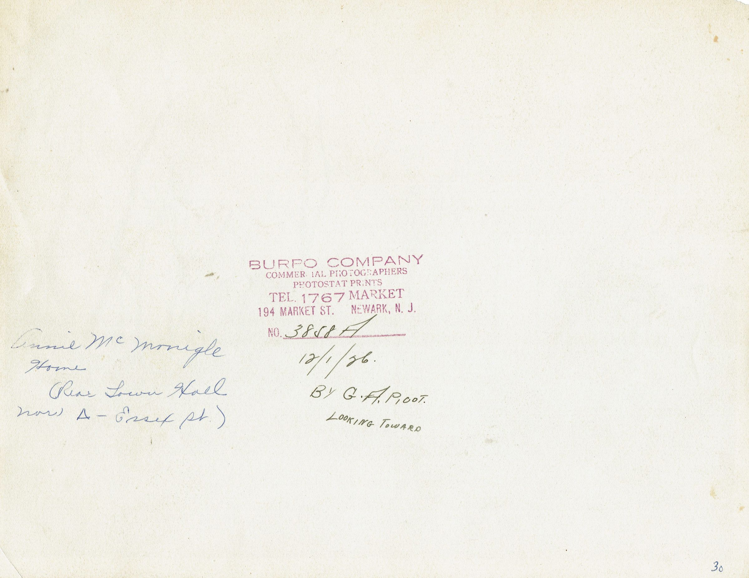 Series of 3 photographs of Annie McMonigall's house near Town Hall in Millburn. An Annie McMonigle is listed in the Millburn Directories starting in 1898. The address listed is Elm Street near Essex, which is behind where the Town Hall stood. The inscription on the back of the photos dates the photos to December 1, 1926.