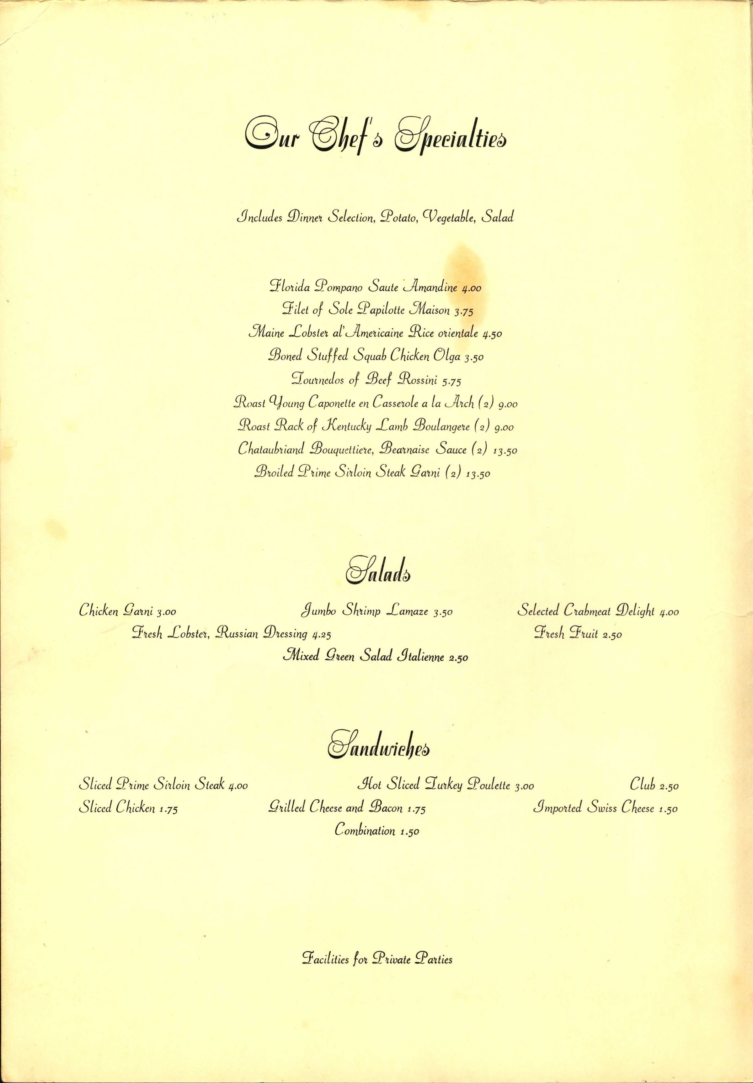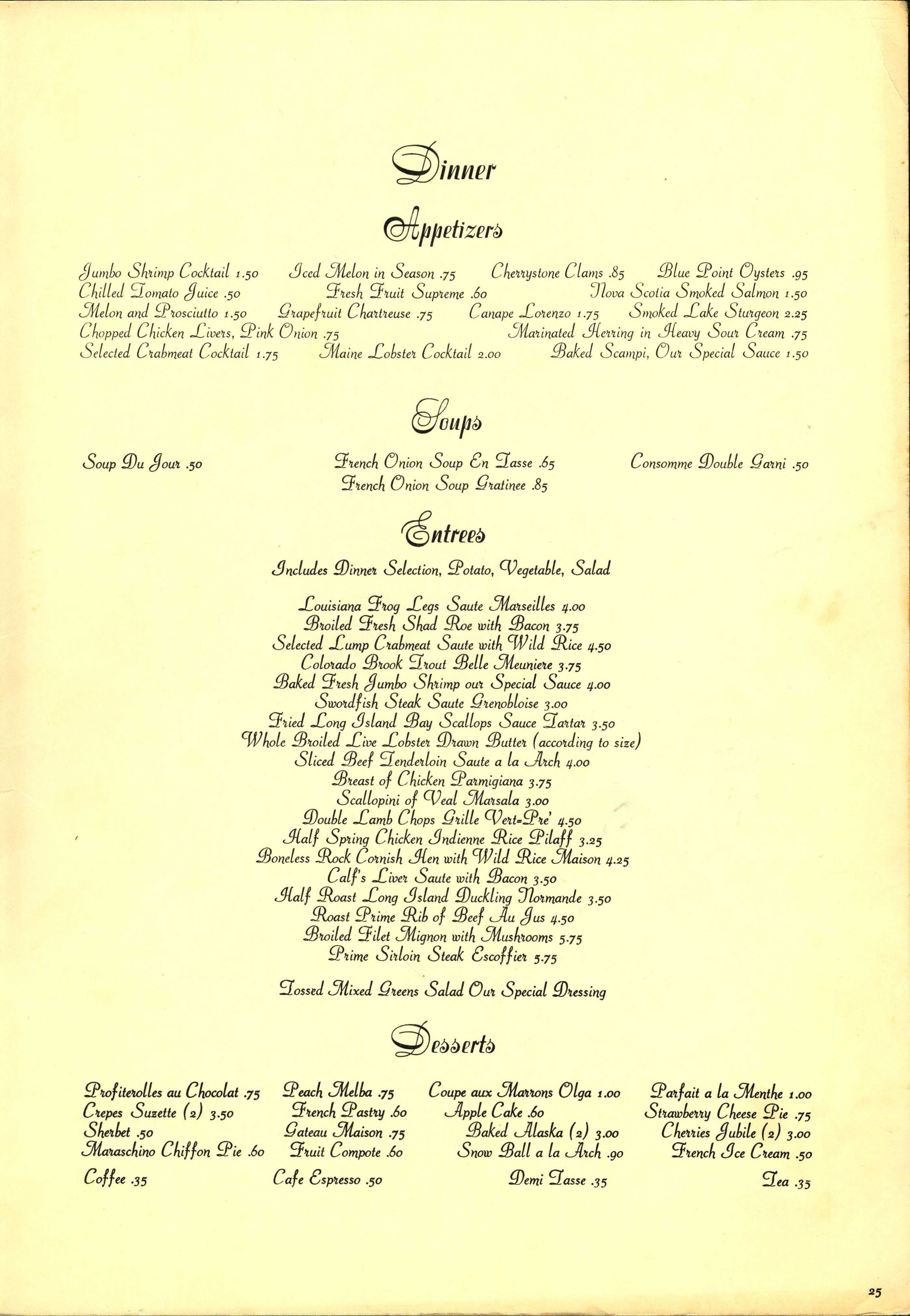 Menu from The Arch Restaurant, Morris Turnpike, Short HillsCollection