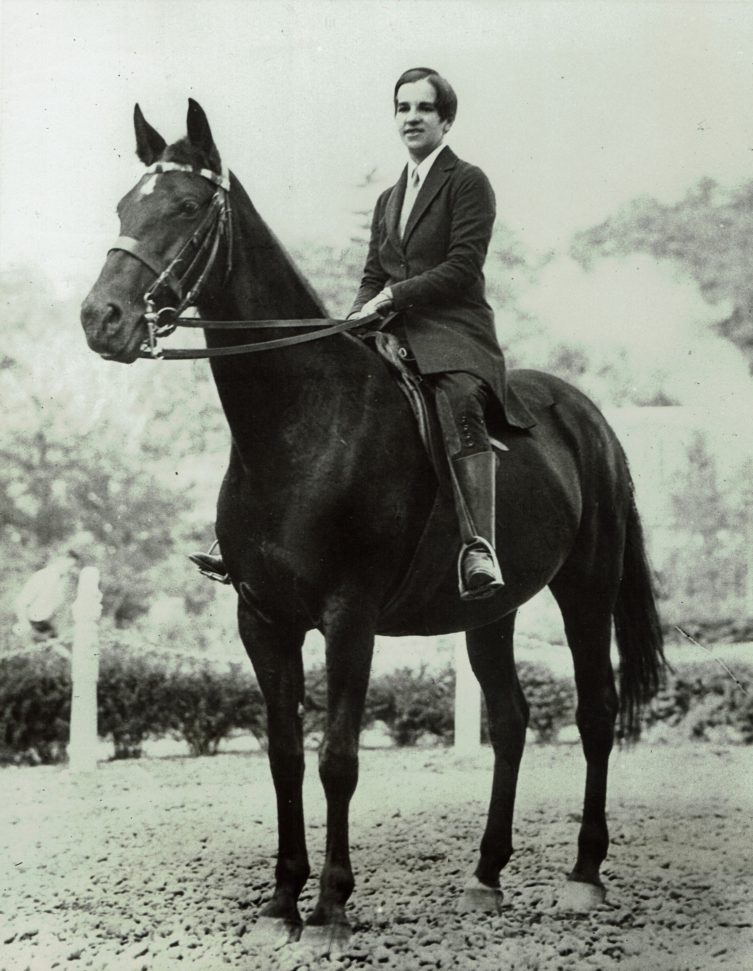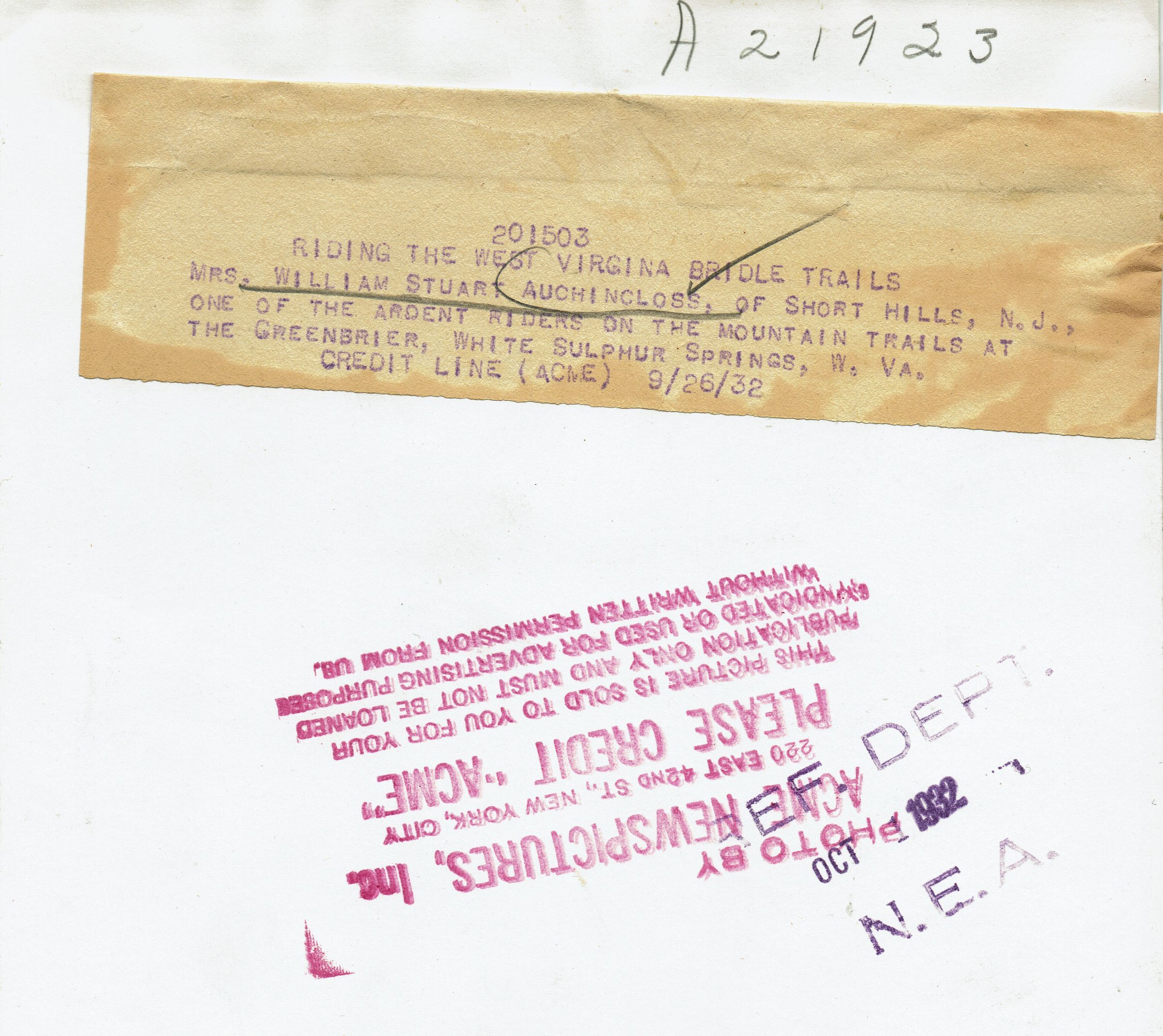 Press photograph of Mrs. William Stuart Auchincloss (Jean Schnell Auchincloss) from 1932. The caption on the back of the photograph reads, "Riding the West Virginia Bridle Trails. Mrs. William Stuart Auchincloss., of Short Hills, NJ, one of the ardent riders on the Mountain Trails at the Greenbrier, White Sulphur Springs, West Virginia. September 26, 1932."