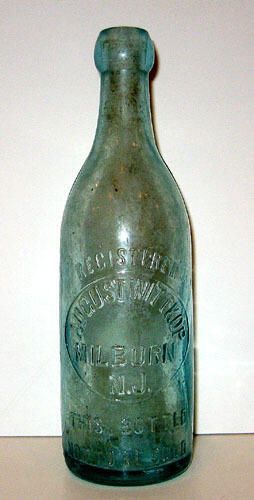A sea-foam colored bottle (probably beer) from approximately the turn of the century. Raised lettering says "Registered August Wittkop Milburn, NJ This Bottle not to be sold." In the 1908 directory, August Wittkop is listed as a beer bottler. Inside of bottle is overly cloudy, possibly from dirt. Purchased on Ebay.Acquisition