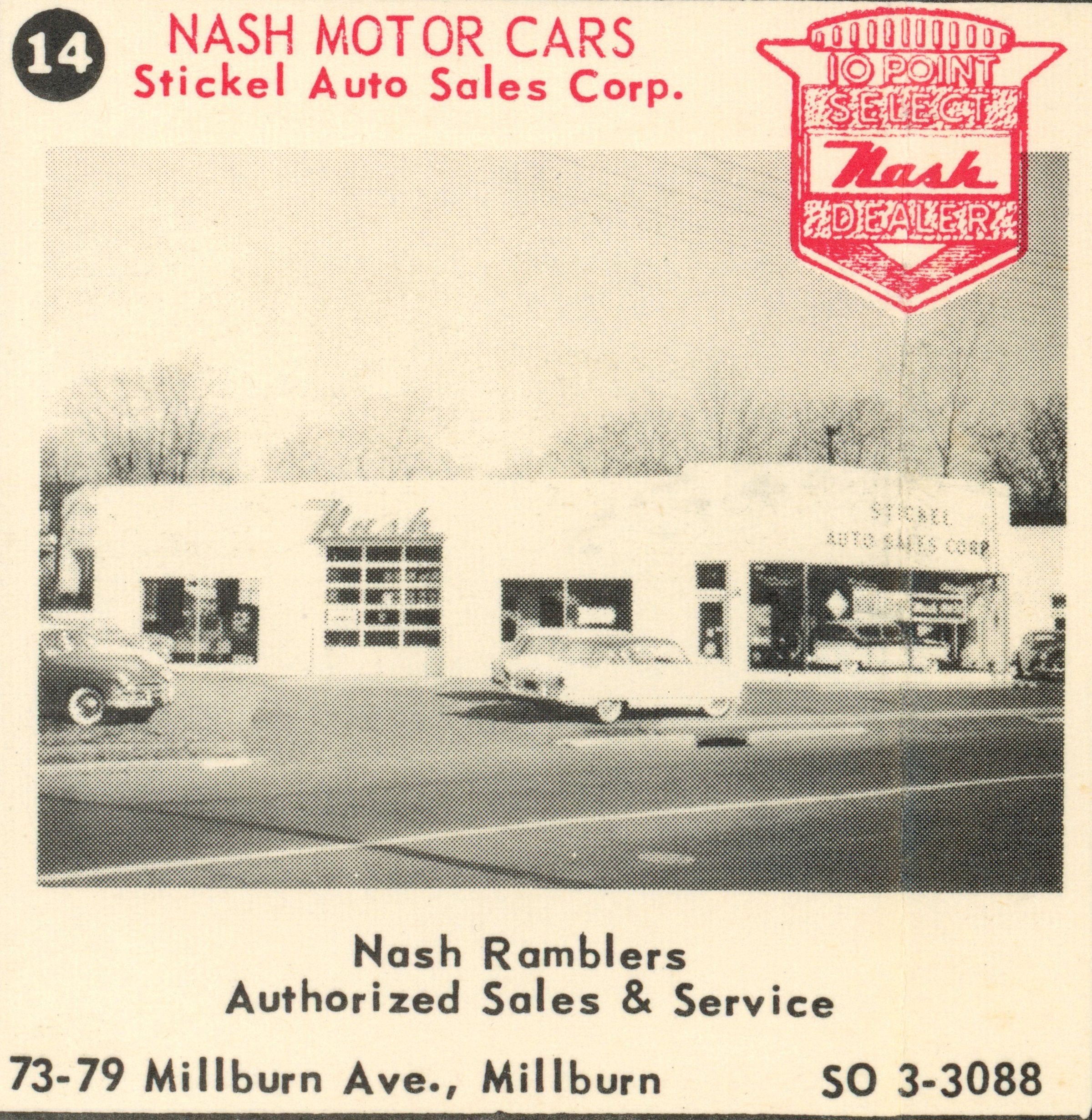 Photograph of Nash Motor Cars, Stickel Auto Sales Corp., 73-79 Millburn Avenue, published in the 1955 Shopper's Guide to Millburn, New Jersey, published by Photolith Advertising Company, Cranford, N.J.Acquisition