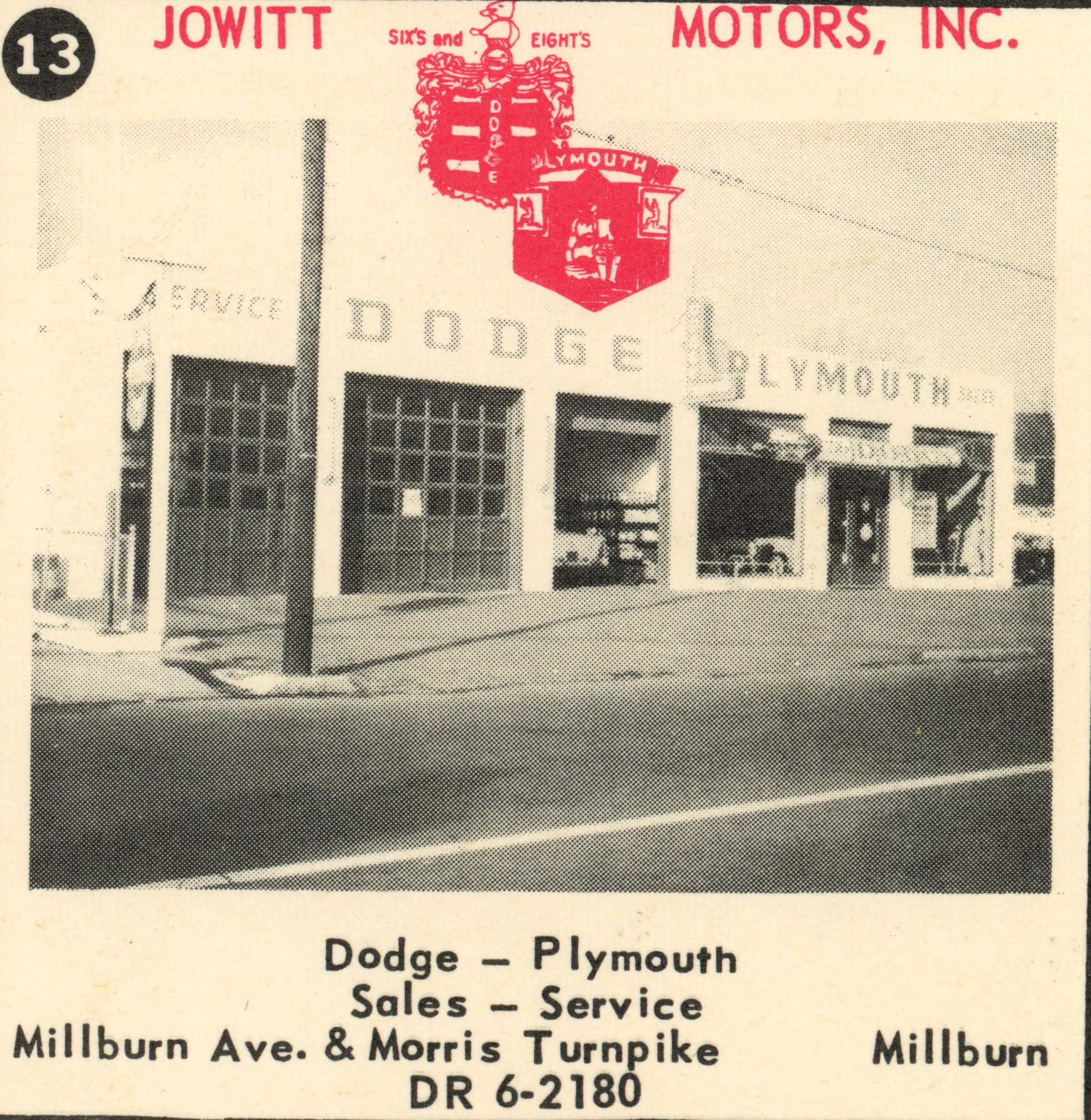 Photograph of Jowitt Motors, Inc., Millburn Avenue and Morris Turnpike, Millburn, published in the 1955 Shopper's Guide to Millburn, New Jersey, published by Photolith Advertising Company, Cranford, N.J. Advertisement highlights Dodge and Plymouth Sales & Service.Acquisition