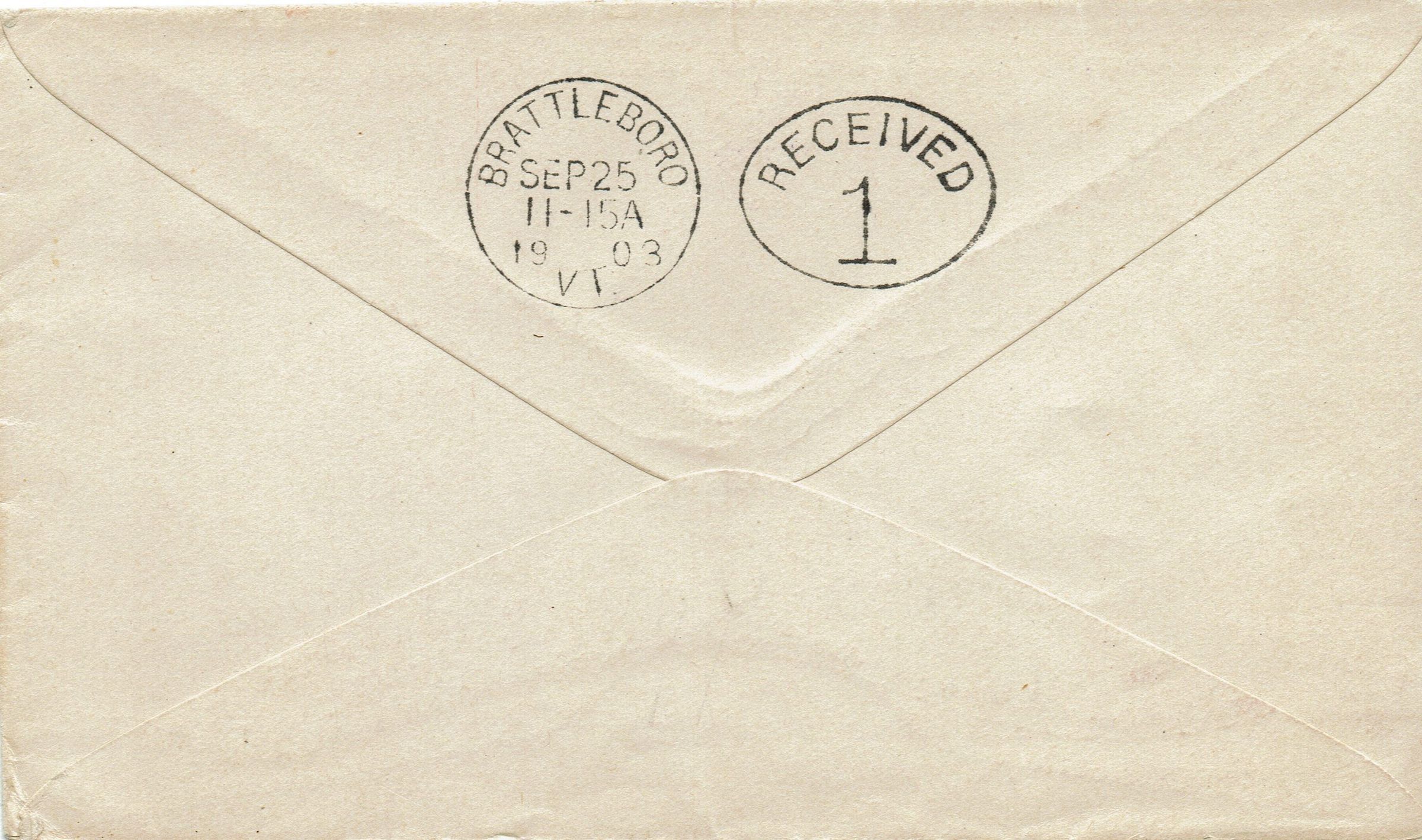 Envelope addressed to Miss Mary E. Smith, Guilford, Vermont postmarked Millburn, 24 September, 1908, 7:00 pm. Return address is: Public Schools, Millburn, Short Hills, Wyoming, Essex County, N.J. Postmark received Brattleboro Vermont, September 25, 1908 at 11:15 am.