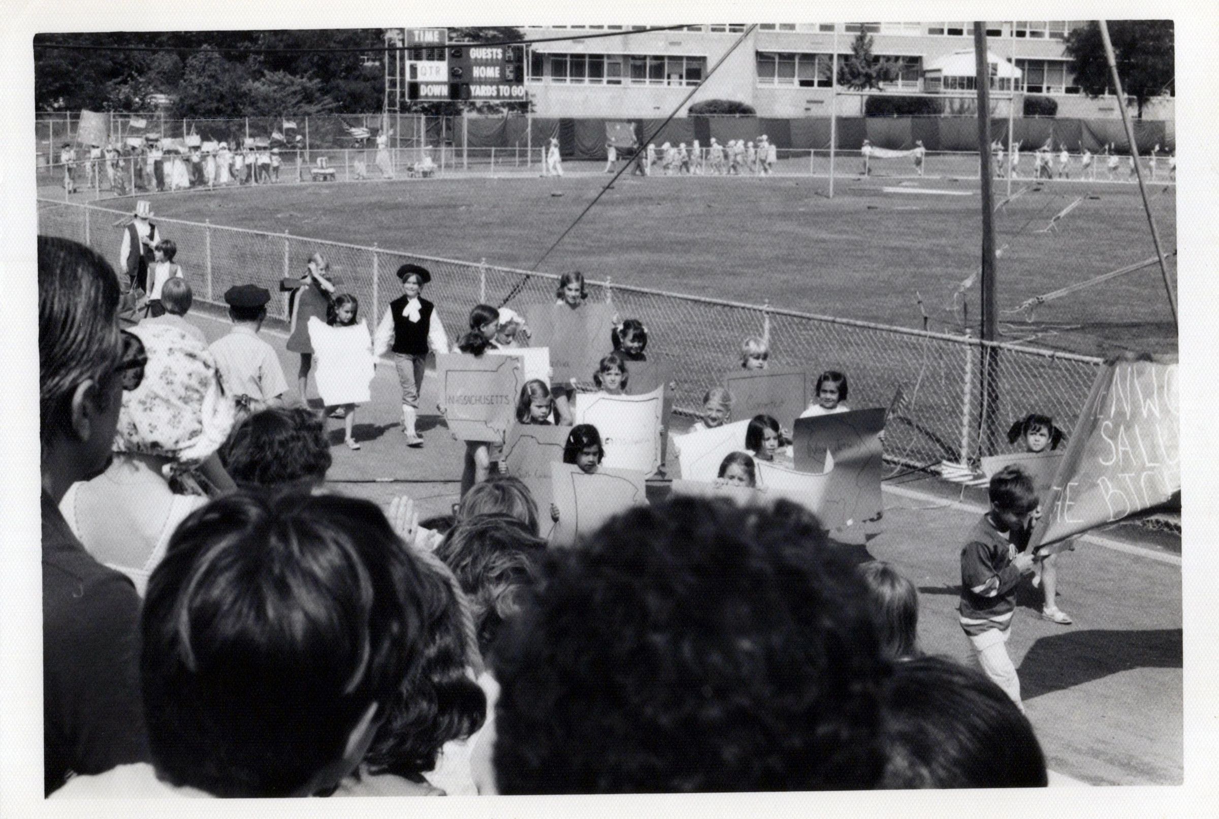 Photograph of the parade of 13 colonies in the July 4, 1976 morning activities at Millburn High School. In the front are students from Glenwood School holding a banner reading "Glenwood Salutes the Bicentennial."Photograph Details