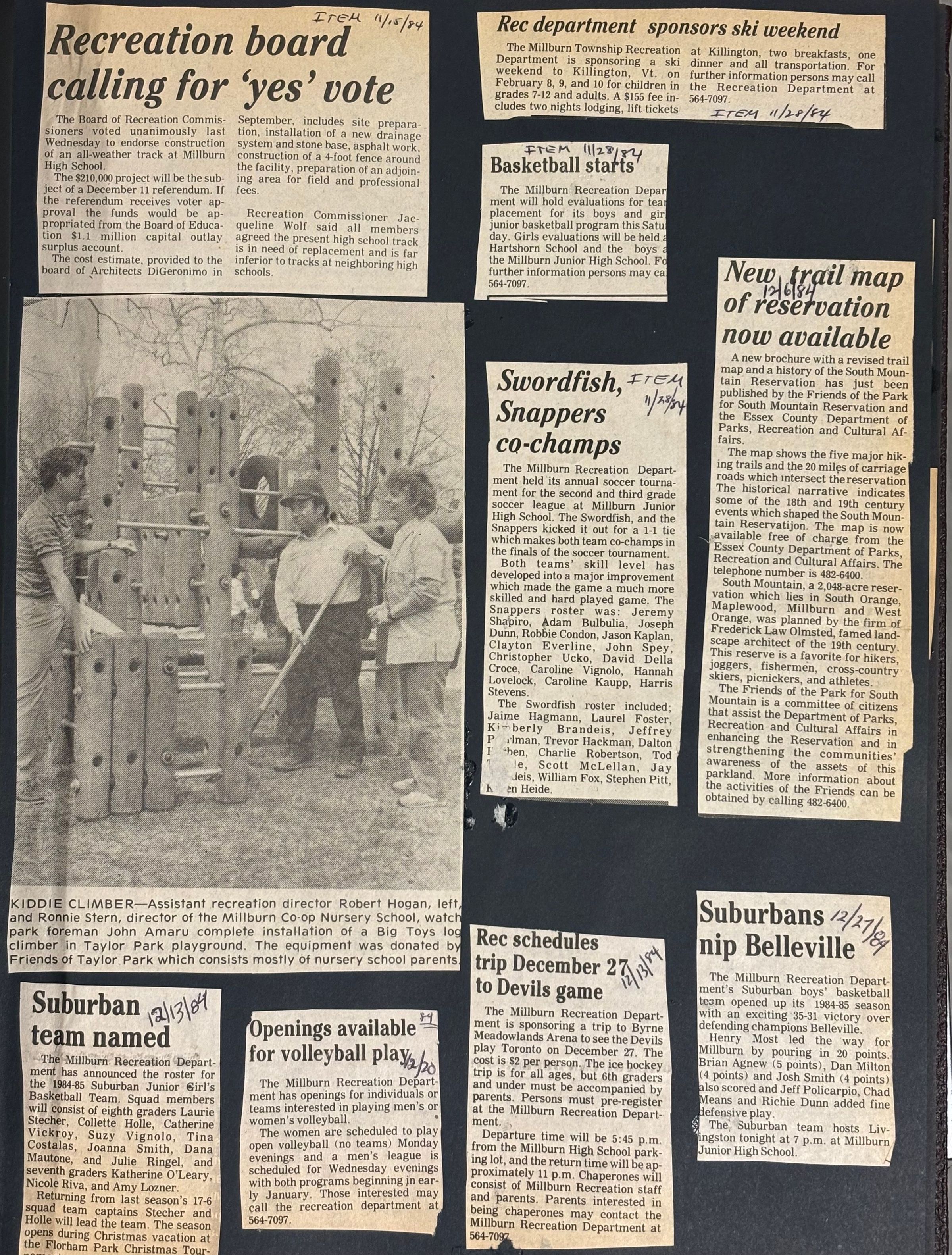 Scrapbook from the Millburn Department of Recreations containing newspaper clippings of Recreation Department Activities from 1984-1985. The clippings are taken from the Item and The Star Ledger.Acquisition