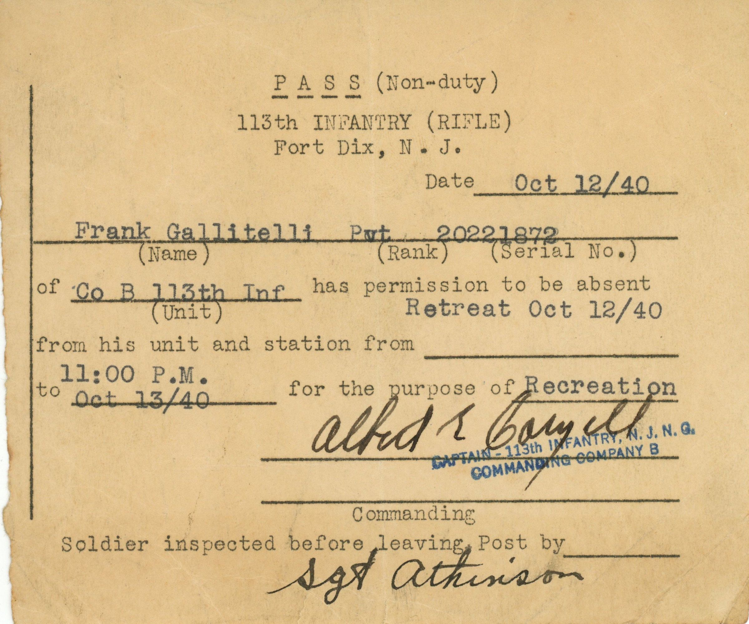 Documents relating to Frank Gallitelli's military service in World War II, including discharge papers, marksmanship card, induction papers, day pass.