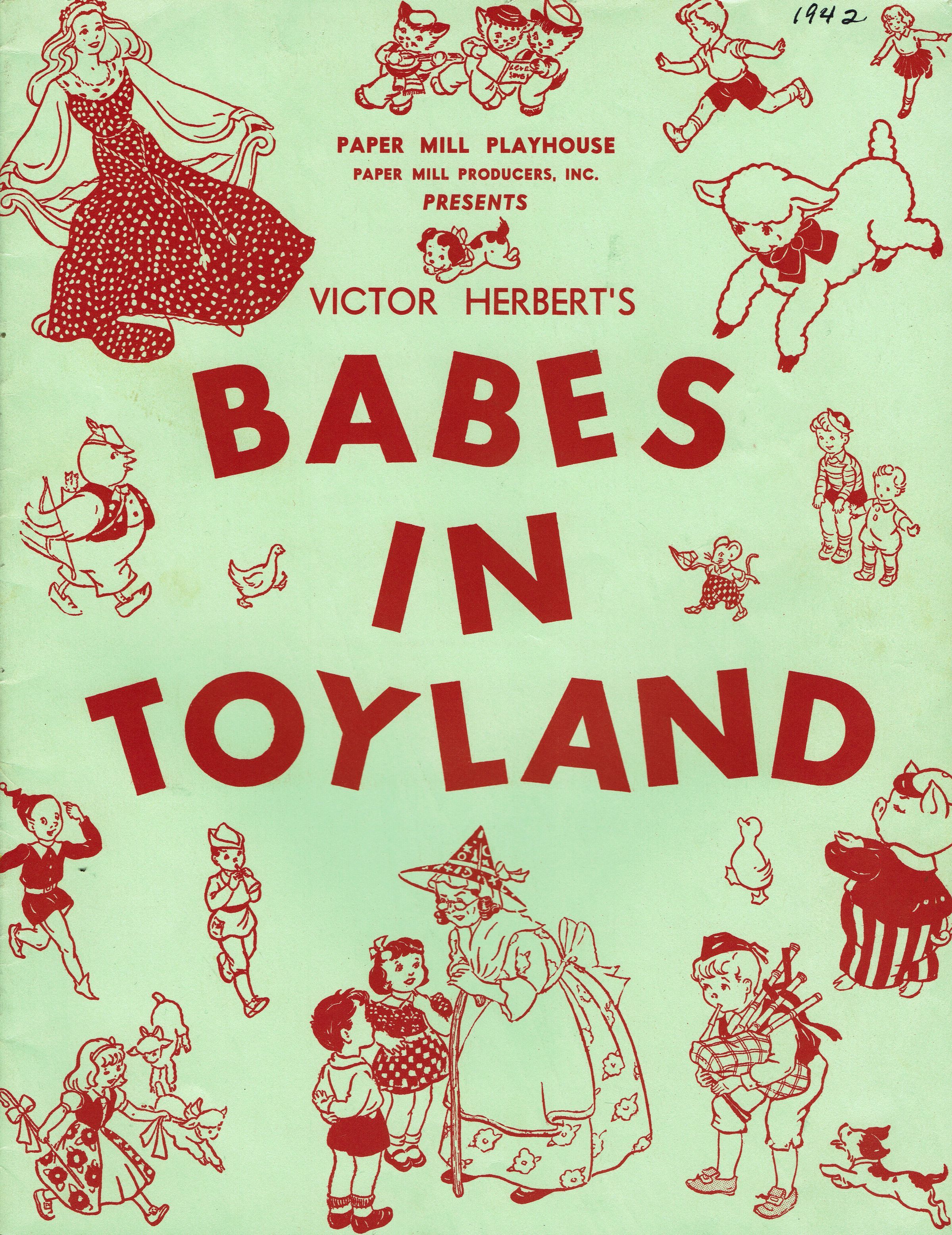 Souvenir Program for 1942 Paper Mill Playhouse Production of "Babes in Toyland" with Gonald Gage, Elizabeth Houston, Lucy Hillary and Yolanda Lupachini. Deluxe fully illustrated program with photographs and articles about Paper Mill Playhouse. 20 pp. (Unpaginated)Collection