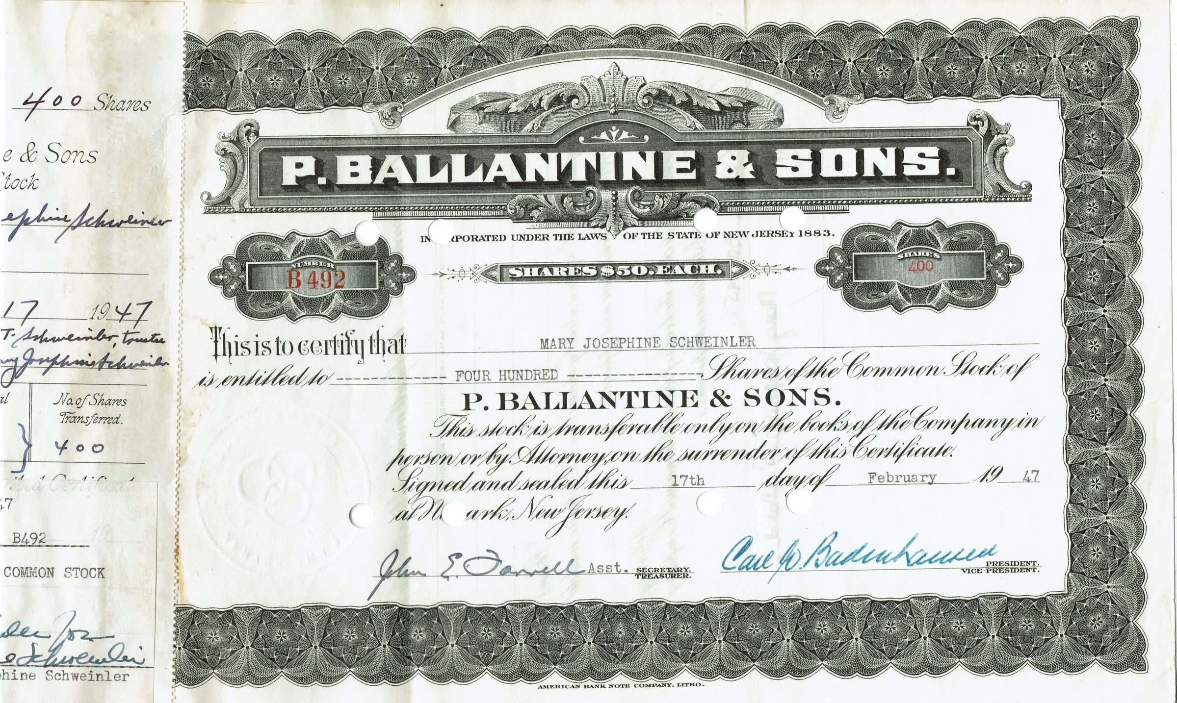 Stock certificate issued to Mary Josephine Swheinler for 400 shares of P. Ballantine & Sons stock on February 17, 1947 and signed by President Carl Badenhausen.Acquisition