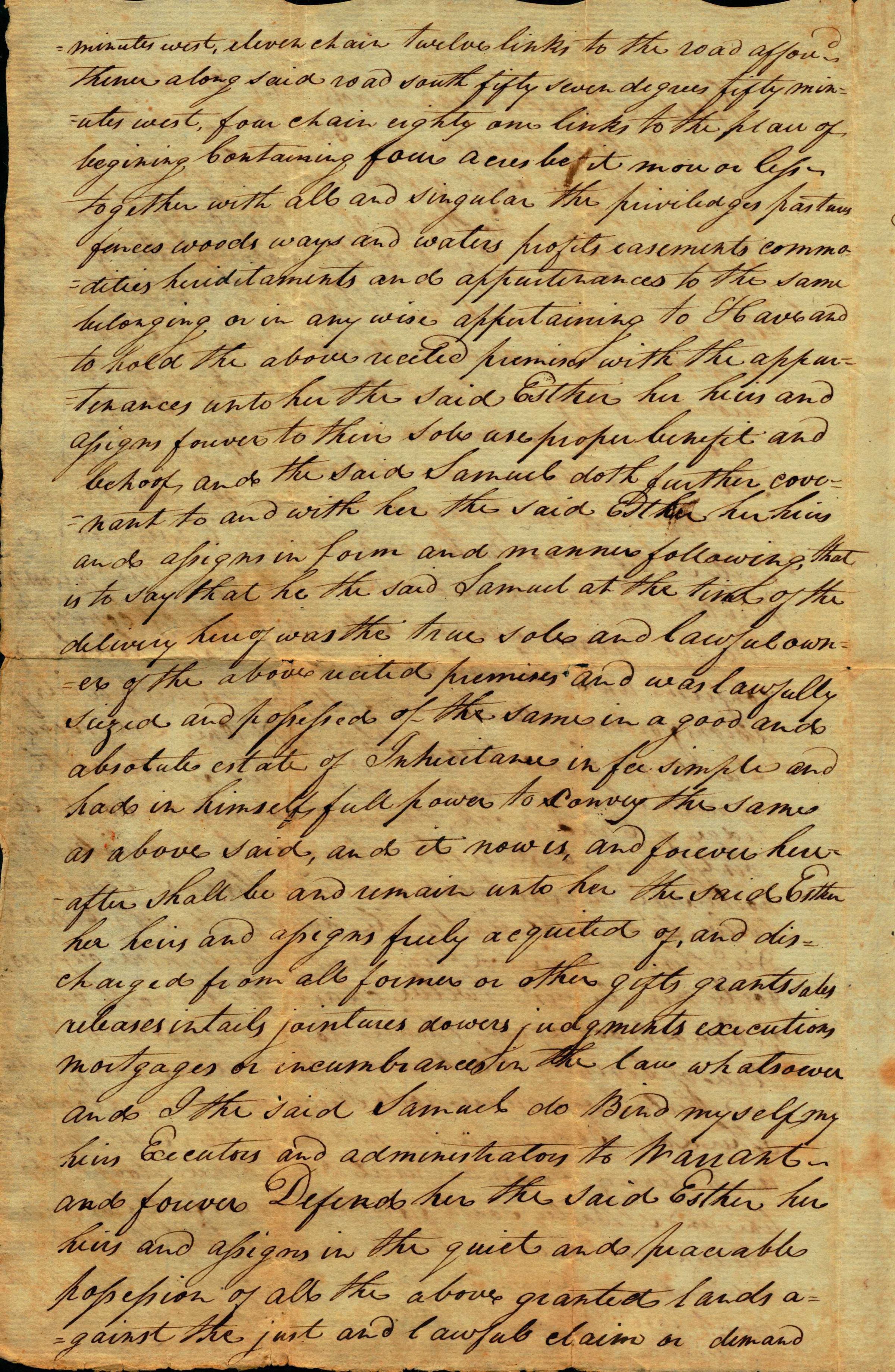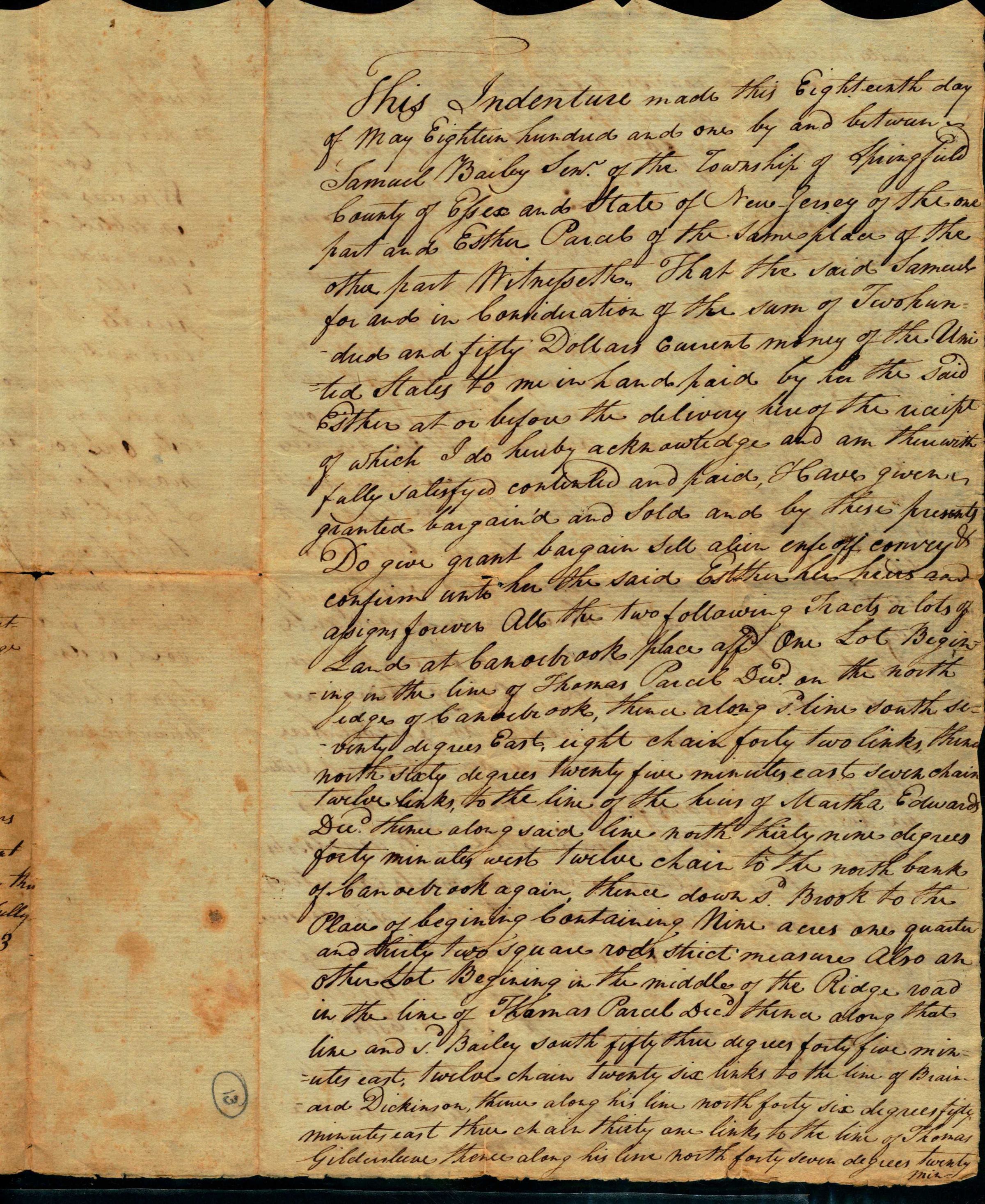This indenture made this Eighteenth day of May Eighteen hundred and one by and between Samuel Bailey Serv. of the township of Springfield County of Essex and State of New Jersey of the one part and Esther Parcel of the same place of the other part Witnesseth. That the said Samuel for and in Consideration of the sum of Two hundred and fifty Dollars current money of the United States to me in hand paid by her the said Esther at or before the delivery here of the receipt of which I do hereby acknowledge and am therewith fully satisfied contracted and paid. Have given in granted bargain'd and Sold and by these presents Do give grant bargain sell (alien enfe off ) convey confirm unto the said Esther her heirs and assigns forever all the two following Tracts or lots of Land at Canoebrook place (aff) One Lot beginning in the line of Thomas Parcel Dec.d on the north edges of Canoebrook, thence along (?) line south seventy degrees East, eight chain forty two links, there north sixty degrees twenty five minutes east seven chains twelve links, to the line of the hairs of Martha Edwards Dec.d thence along said line north thirty nine degrees forty minutes west twelve chain to the north bank of Canoebrook again, thence down s. (degrees) Brook to the Place of beginning containing nine acres one quarter and thirty two rods strict meansures. Also an other Lot beginning in the middle of the Ridge road in the line of Thomas Parcel Dec.d thence along that line and s. (degrees) Bailey south fifty three degrees forty five minutes east, twelve chain twenty six links to the line of Brain-and-Dickinson, thence along his line north forty six degrees fifty minutes east three chain thirty one links to the line of Thomas Gildersleeve thence along his line north forty seven degrees twenty nine minutes west, eleven chain twelve links to the road....Acquisition
