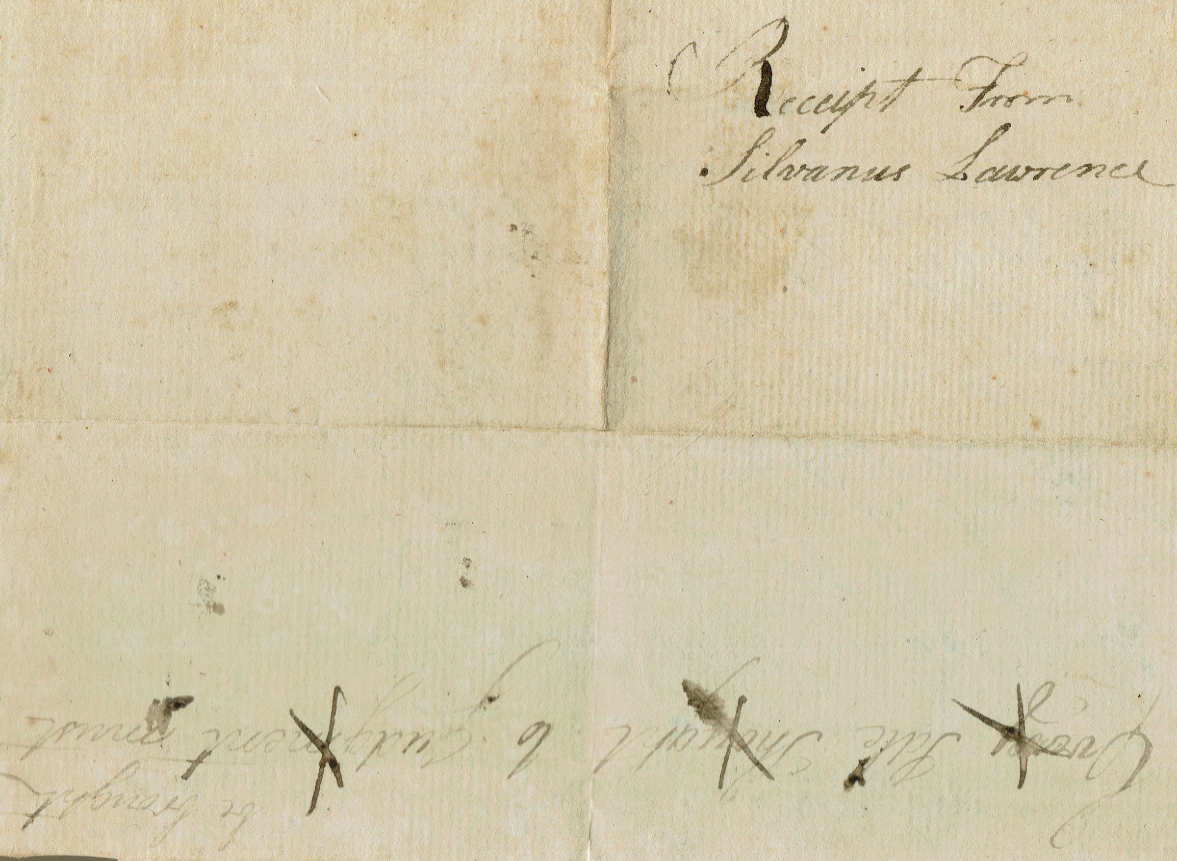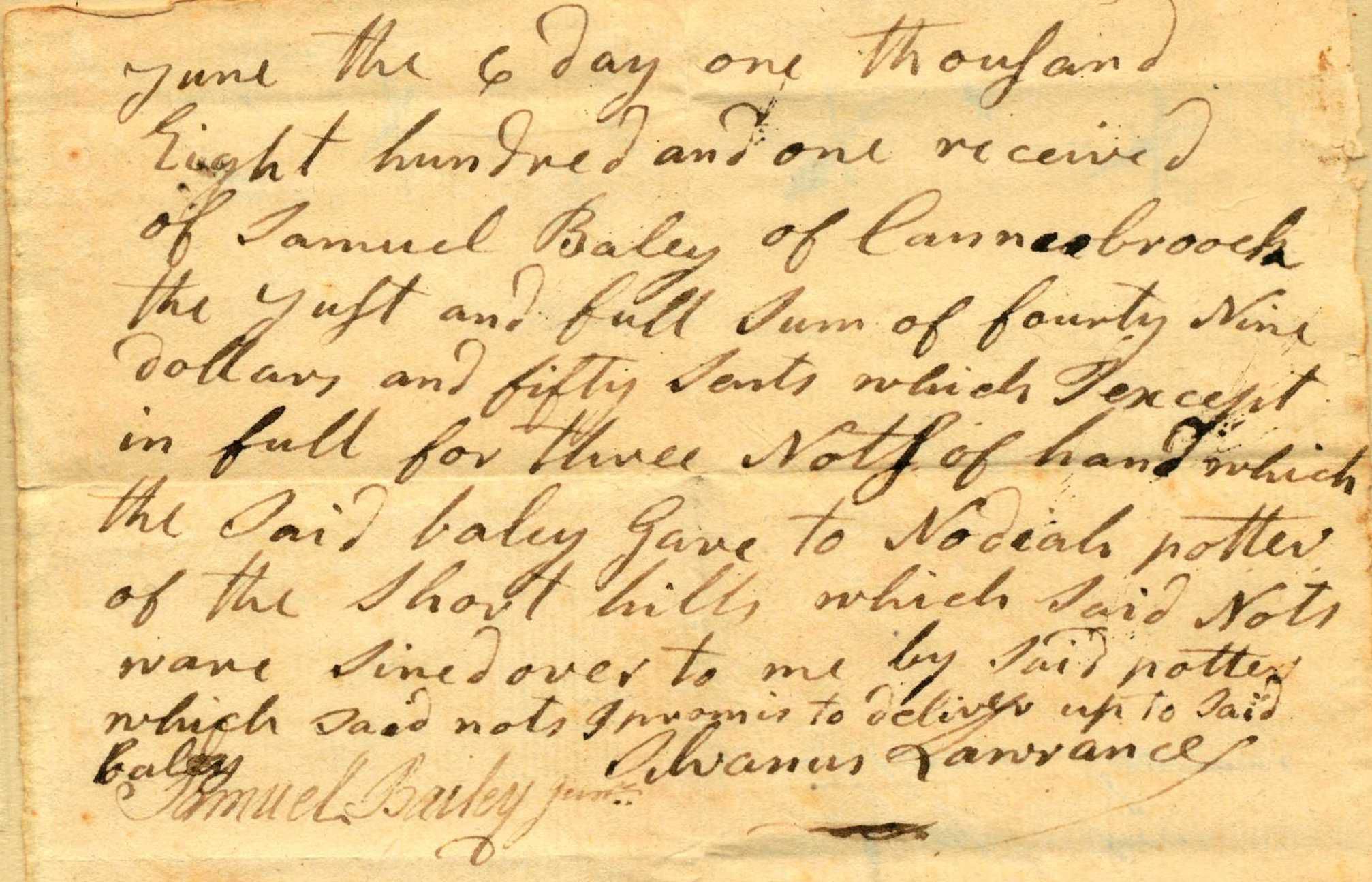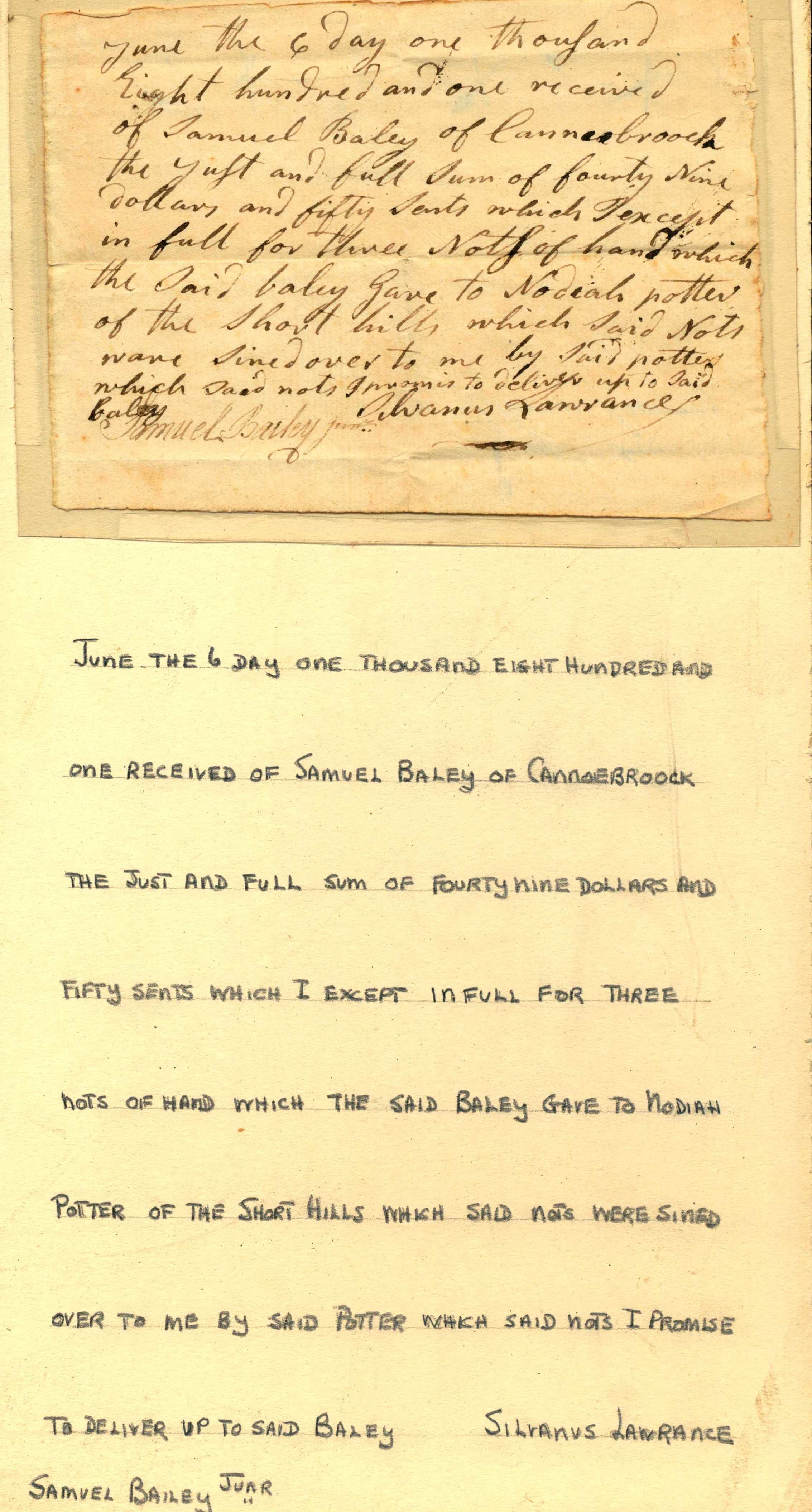 Note from Samuel Bailey to Silvanus Lawrence, June 6, 1801. Note reads: "June the 6 day one thousand eight hundred and one received of Samuel Baley (sic) of Cannoebroock the just and full sum of fourty nine dollars and fifty sents which I except in full for three Nots of hand which the said Baley gave to Nodiah Potter of the Short Hills, which said Nots were sined over to me by said potter said nots I promise to deliver up to said Baley. Signed Samuel Bailey Jr, Silvanus Lawrance ."