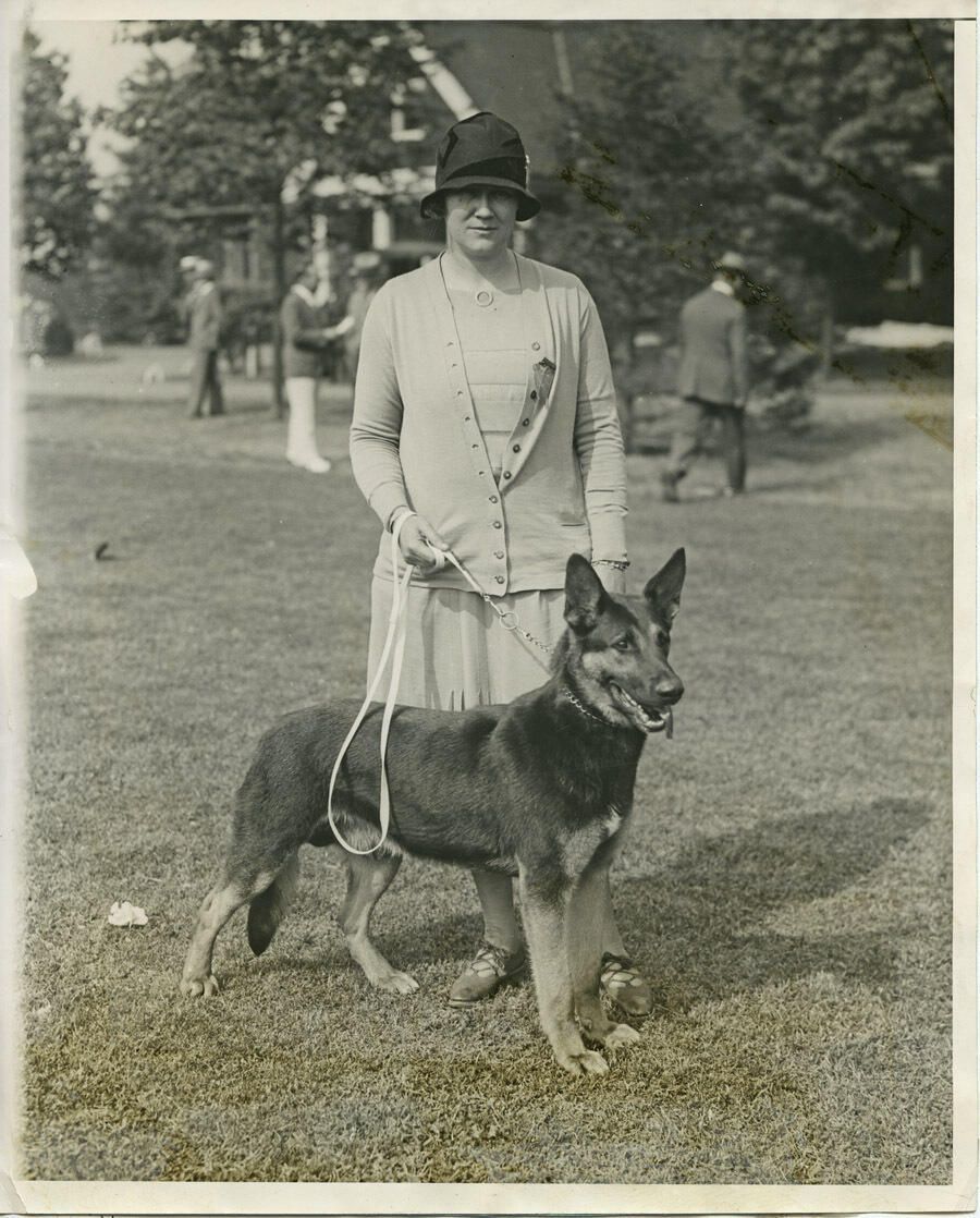 B/W glossy press photo from June 6, 1928 of Mrs. Charles Baiter (Madeline E. Baiter) of Short Hills and her "winning dog, Inkee of Romont, a shepherd." There are three silvered diagonal stripes across the upper right corner, which are perfectly straight and seem to have been caused by something laying on the photo there. There seems to be some adhesive residue along the bottom edge of the front of the photo, on the right half of the photo. It seems to have been left by the blue caption-paper on the back that may have been folded over to the front bottom edge. There is a 1" long finger-like dull spot in the middle of the left edge of the front and three pinhead-sized indentations nearby. Corners are bumped and edges of the photo are worn. On the back of the photo is a caption typed on a strip of blue paper: "SECOND ANNUAL DOG SHOW MORRIS AND ESSEX KENNEL CLUB -- Pictured above is Mrs. Charles Baiter of Short Hills, N.J. with her winning dog, Inkee of Romont, a shepherd. Taken at the second annual dog show of the Morris and Essex Kennel Club at the Giralda Farms, Madison, N.J.; YOUR CREDIT LINE must read (ACME)" In pencil on the back is "A10279" and, typed, "O.K. for Cleveland." Stamped on the back is This photo is supplied by; ACME NEWSPICTURES; 461 Eighth Ave; New York City; Not to be used for syndication; or advertising purposes without; written permission." Also stamped on the back is: "Refered(sic) -- E. Dept; JUN 6 28 --;N.E.A."Photograph Details
