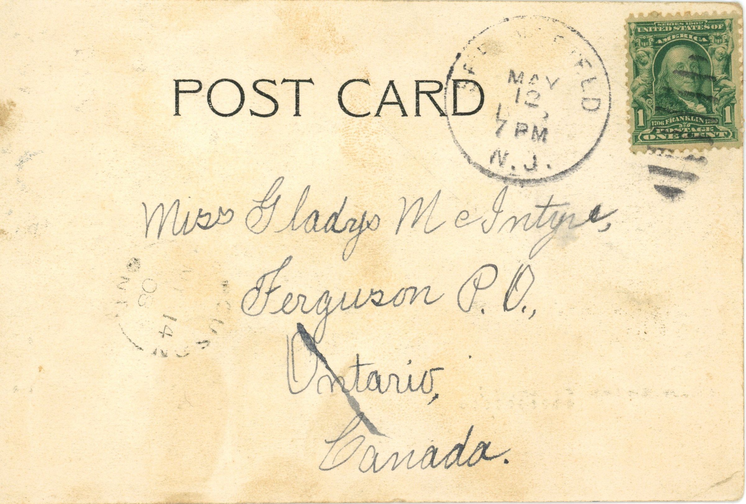 Postally used postcard of Baltusrol Golf Links addressed to Miss Gladys McIntyre, Ferguson P.O., Ontario, Canada, postmarked Springfield, May 12, 7 p.m. Message on front reads: May 12, 1908. Springfield, N.J. "This is where great games of golf are played. How you not time to write to me? All are well, hope you are the same. With love, Mary."Collection