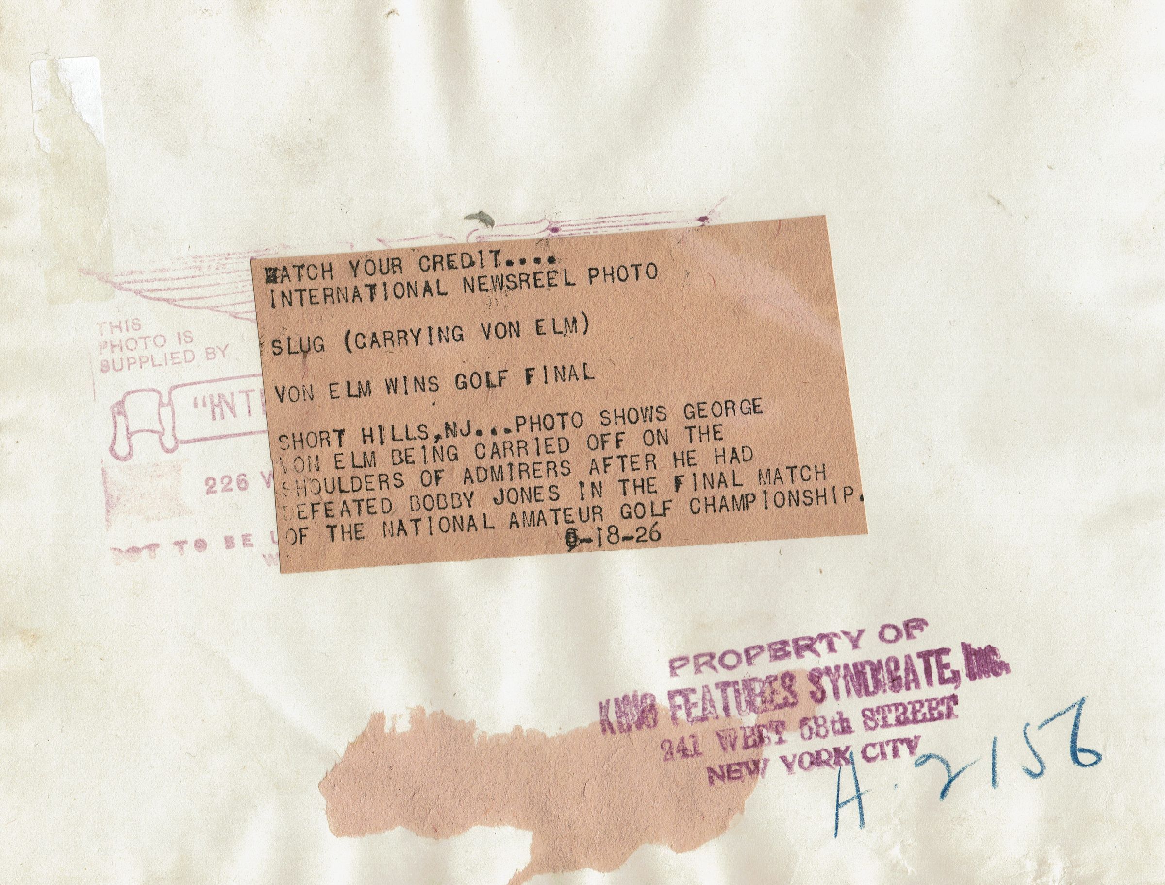 International Newsreel Photograph of George Von Elm beingcarried off on the shoulders of admirers after defeating Bobby Jones in the final matio of the National Amateur Gold Championship at Baltusrol Golf Club in "Short Hills," NJ, September 18, 1926.