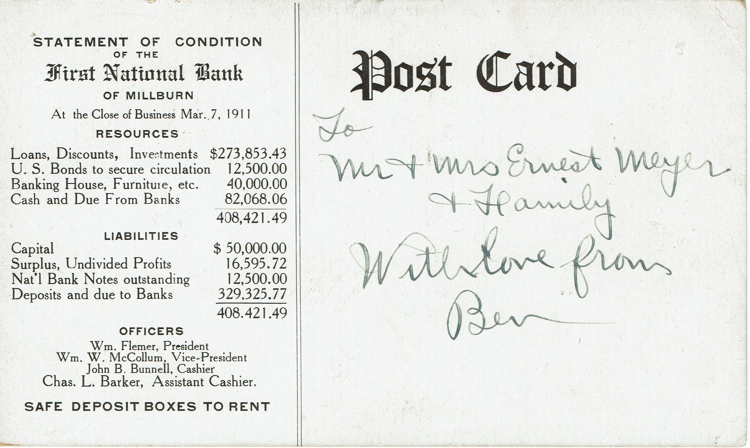 Verso of card has information on the State of Condition of the First National bank of Millburn at the close of Business March 7, 1911.
