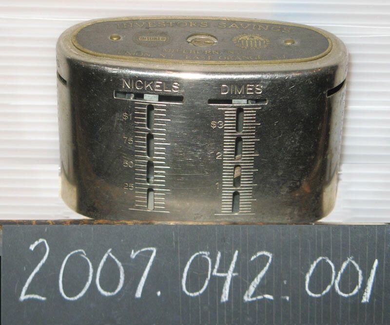 A small stainless-steel savings bank with metal plate on top marked Millburn N.J., Union, N.J., East Orange, N.J. Bottom stamped "The Traveling Teller" and "The Automatic Recording Safe Co." Fine network of light scuffs and scratches all over, in addition to light overall grime.Acquisition