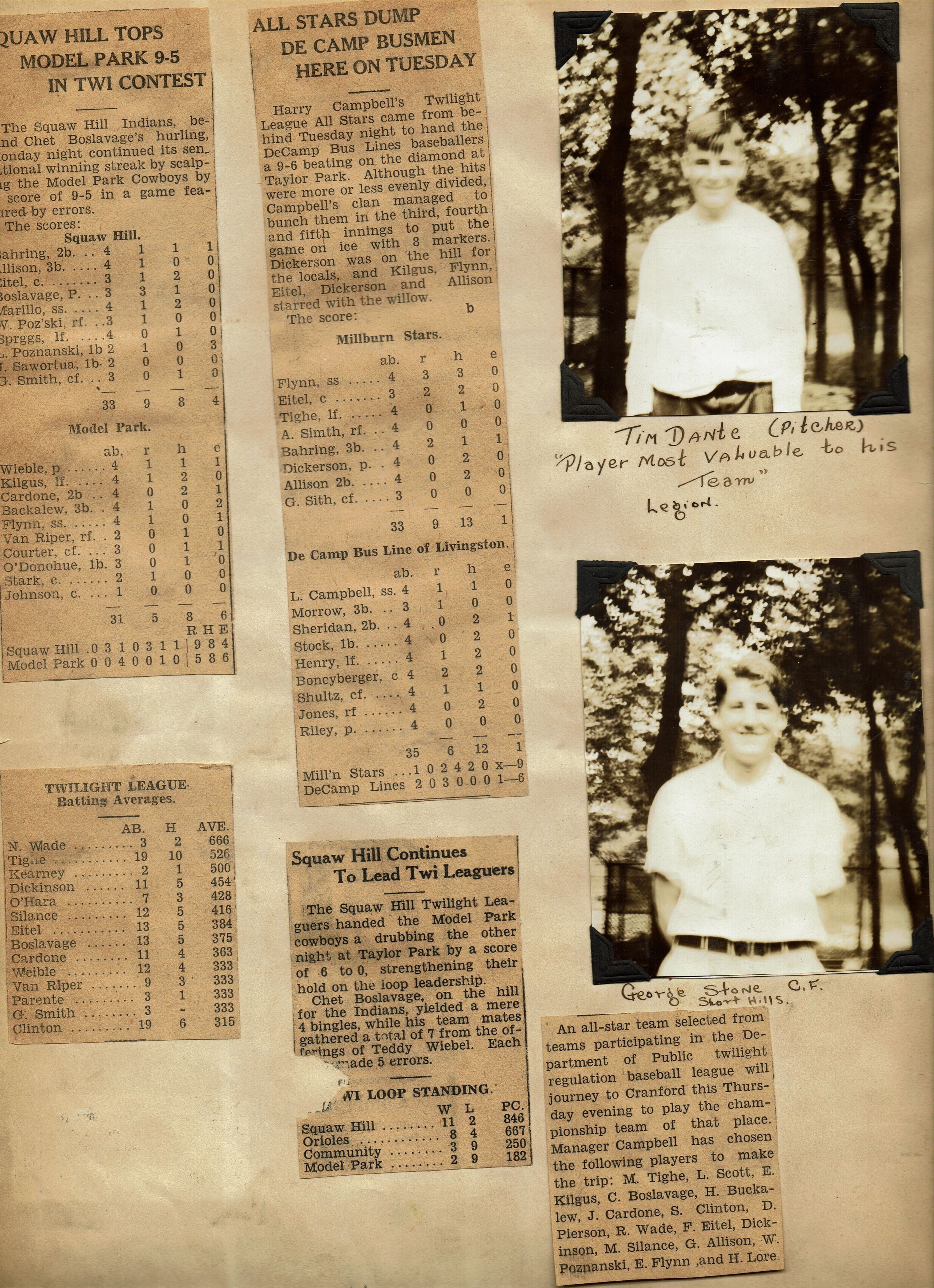 Photographs of the All Star Junior League Baseball Team from the 1930 Millburn Recreation Department Scrapbook. Team members pictured are: Pat Lonergan, Carmen Pariso, Ed Storey, Tony Picciuto, "Chick" Cianci, "Red" Almond, Herb Ellis, Joe Saladino, Alfred Van Sant, Tim Dante (Pitcher), George Stone. Article in The Item of Millburn-Short Hills, April 23, 1930, describes the team.Acquisition