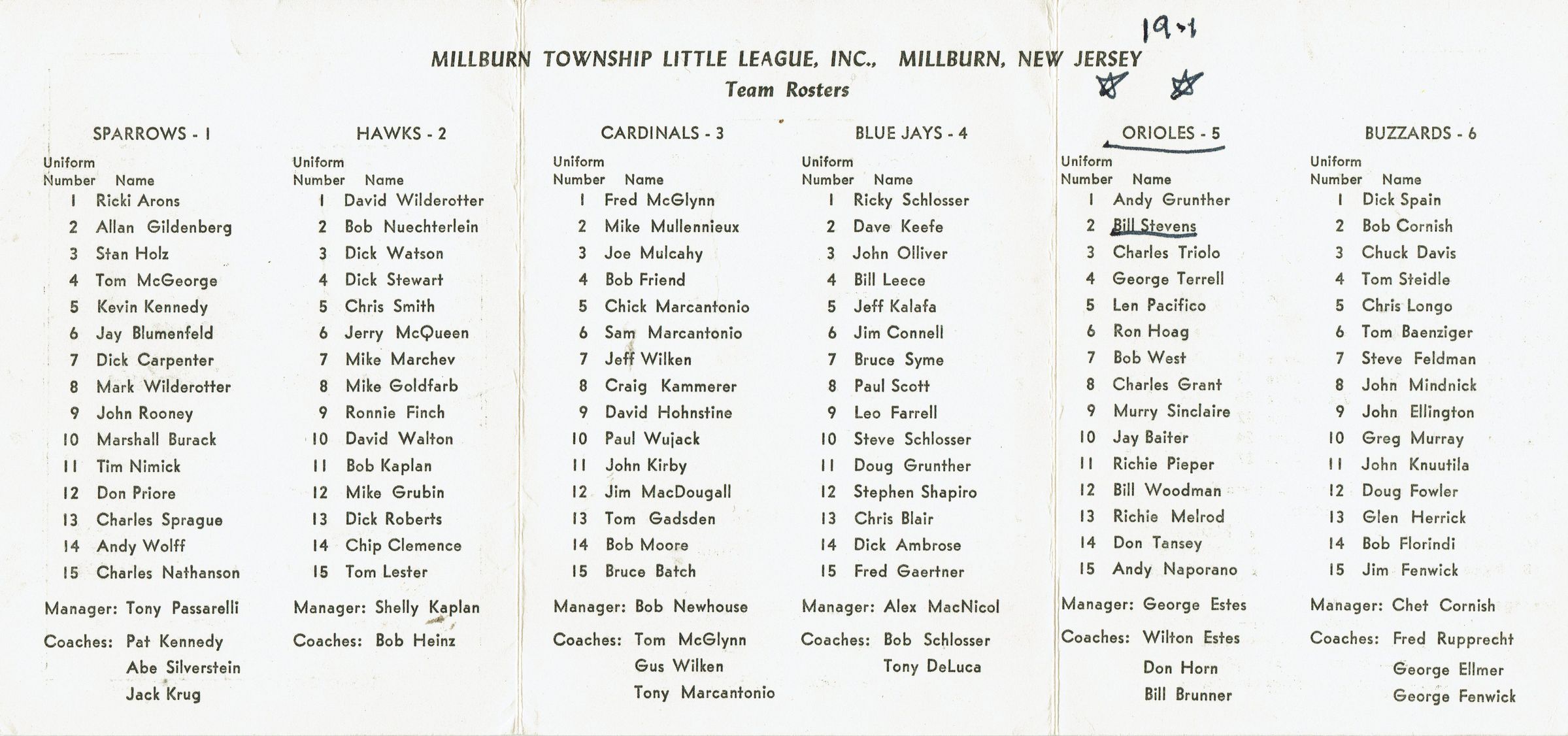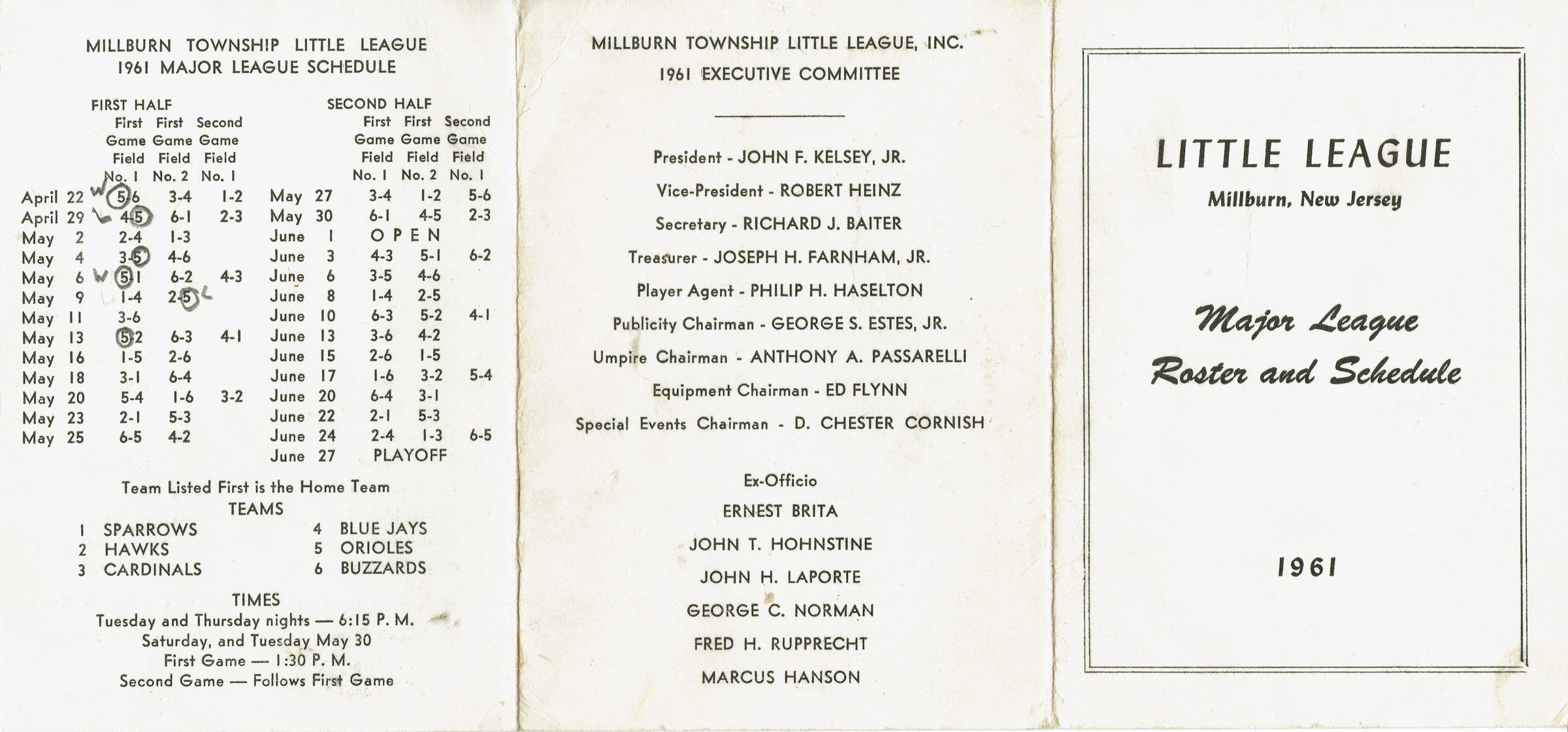 Members of the Millburn Township Little League, Inc., 1961 Executive Committee were John F. Kelsey, Jr., Robert Heinz, Richard J. Baiter, Joseph H. Farnham, Jr., Philip H. Haselton, George S. Estes, Jr., Anthony A. Passarelli, Ed Flynn, and D. Chester Cornish.Acquisition