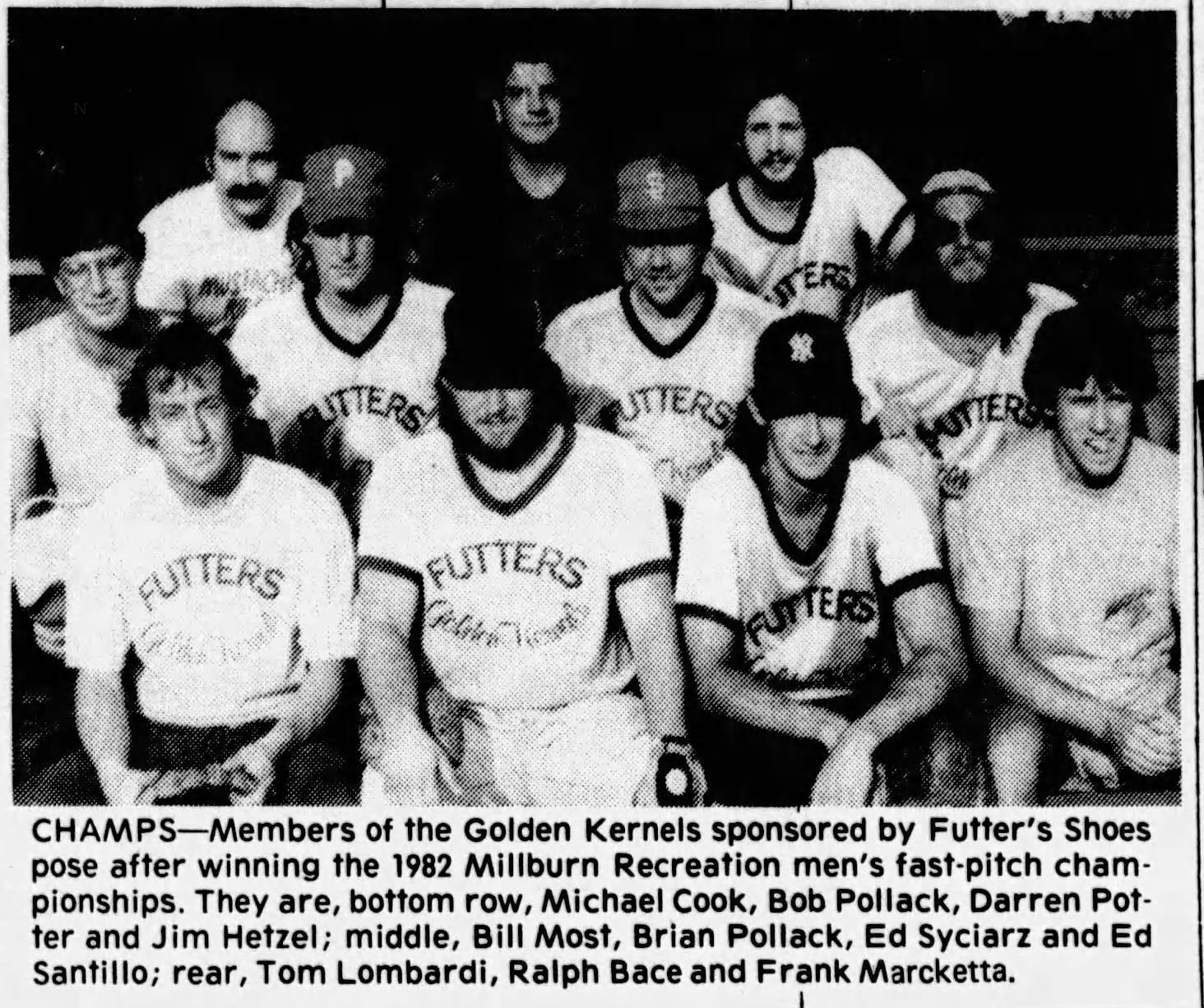 Photograph of Millburn Recreation Department's Golden Kernels baseball team sponsored by Futter's Shows after winning the 1982 men's fast-pitch championships in August 1982. The photograph was published in the Item, August 5, 1982 and shows: Bottom Row: Michael Cook, Bob Pollack, Darren Potter and Jim Hetzel; Middle-Bill Most, Brian Pollack, Ed Syciarz and Ed Santillo; Rear-Tom Lombardi, Ralph Bace and Frank Marcketta.Acquisition
