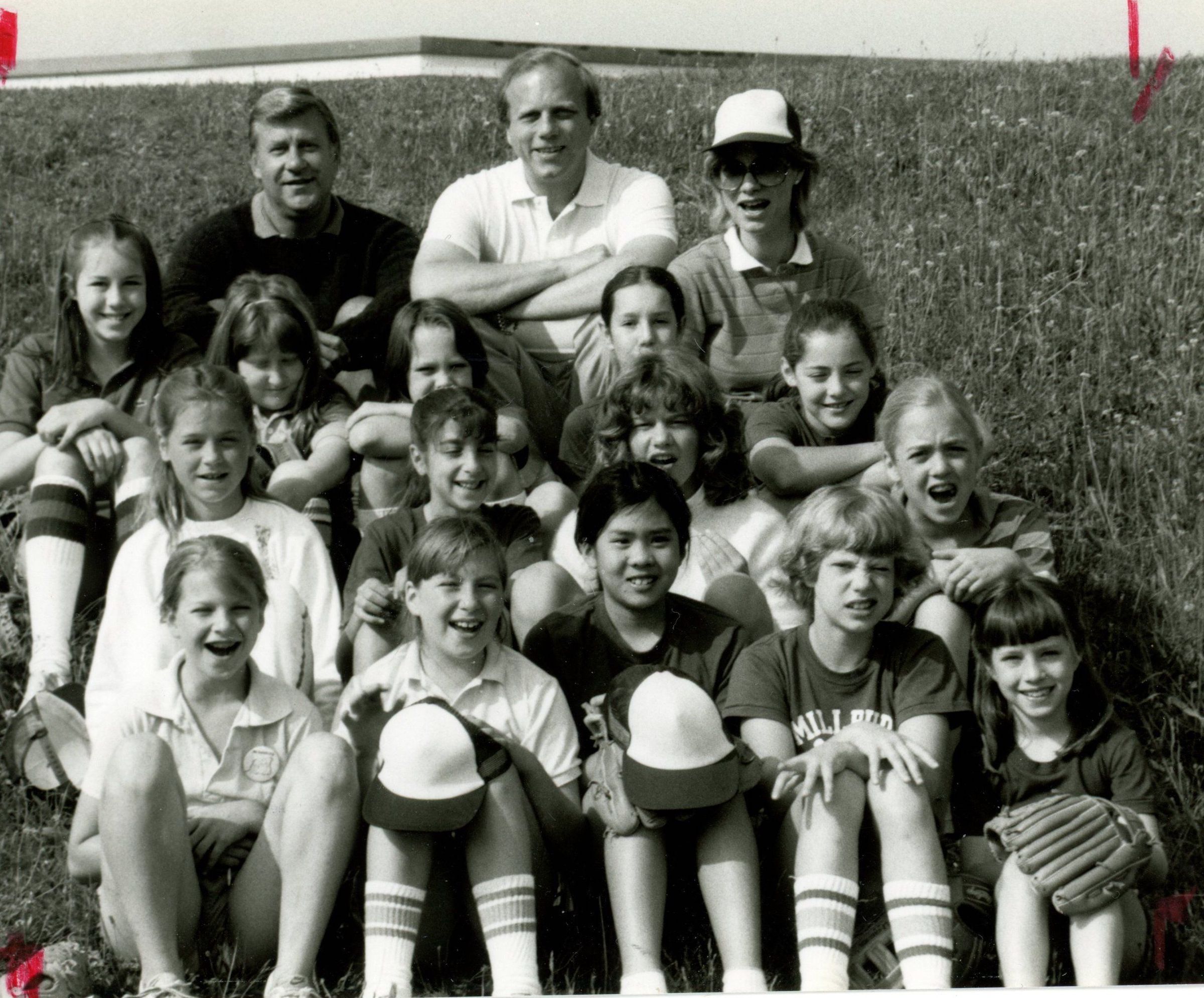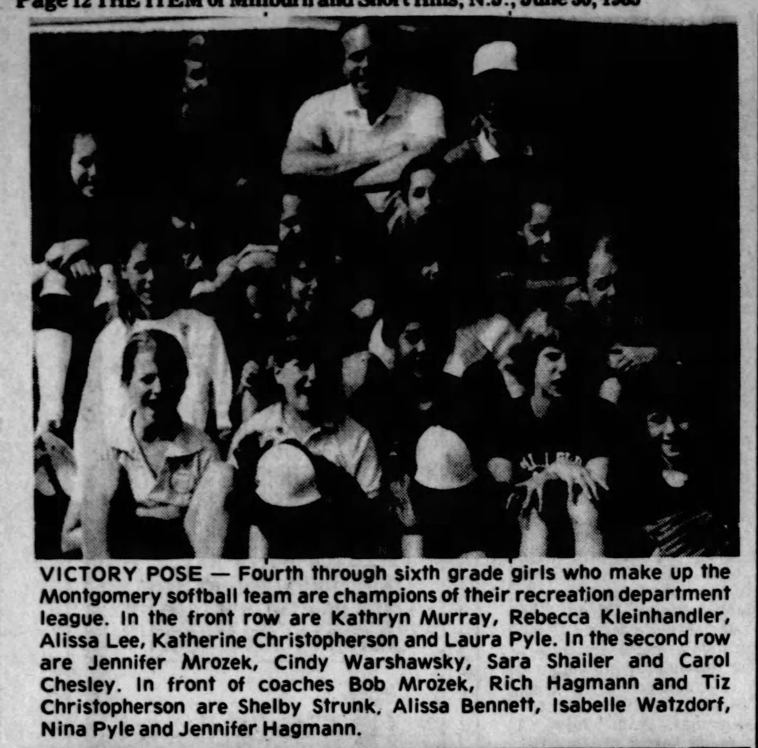 Photograph of the Millburn Recreation Department 4th-6th grade girls softball league champion Montgomery softball team from June 1983. Pictured are: Front Row-Kathryn Murray, Rebecca Kleinhandler, Alissa Lee, Katherine Christopherson and Laura Pyle; Second Row-Jennifer Mrozek, Cindy Warshawsky, Sara Shailer and Carol Chesley; Third Row: Shellby Strunk, Alissa Bennett, Isabelle Watzdorf, Nina Pyle and Jennifer Hagmann; Last Row: Coaches Bob Mrozek, Rich Hagmann and Tiz Christopherson.Acquisition