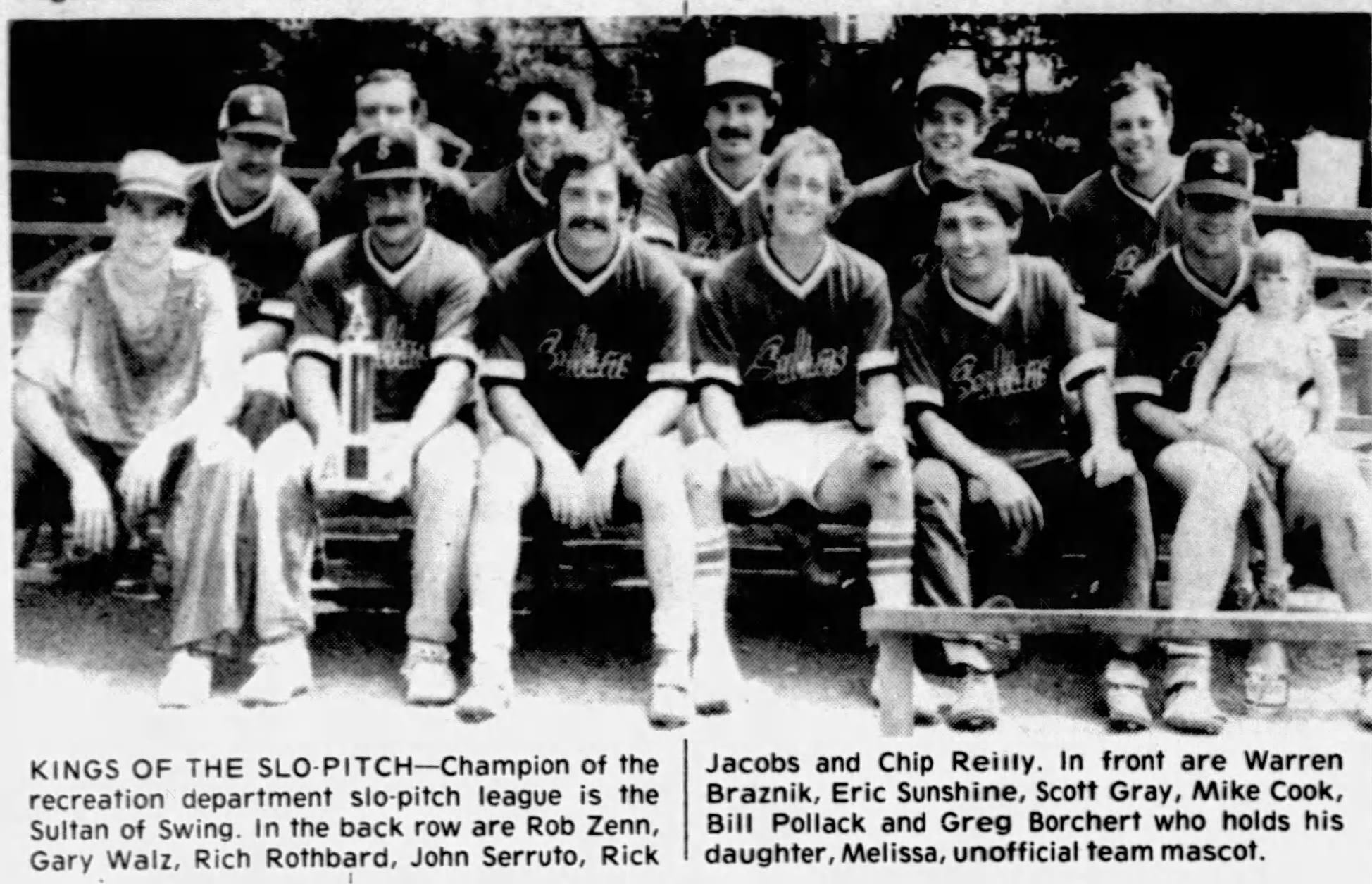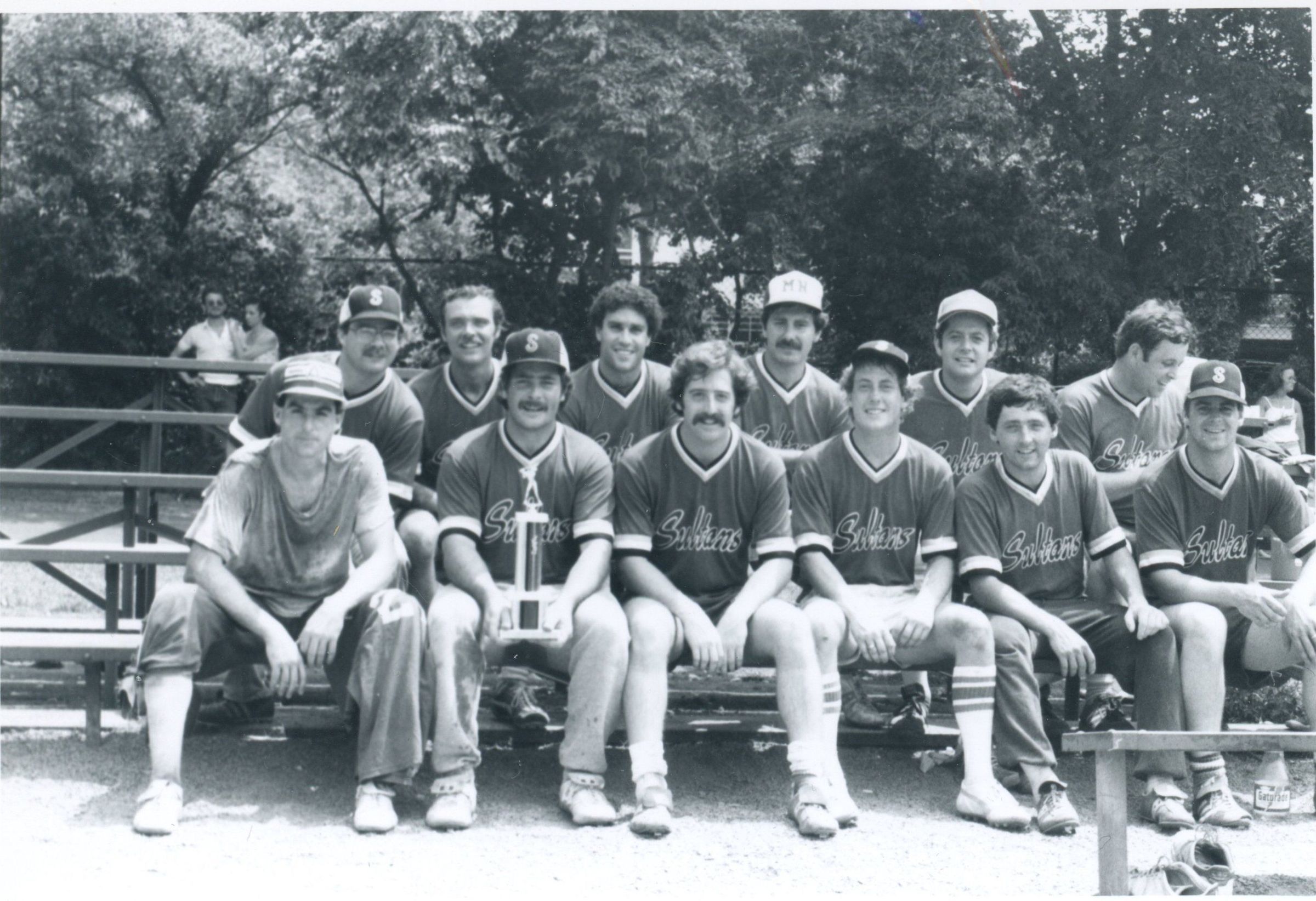 Photograph of the 1982Millburn Recreation Department Slo-Pitch League champion team, the Sultans, showing from left to right: Front Row-Warren Braznik, Eric Sunshine, Scott Gray, Mike Cook, Bill Pollack and Greg Borchert. Back Row: Rob Zenn, Gary Walz, Rich Rothbard, John Serruto, Rick Jacobs and Chip Reilly. Photograph from the Item, July 29, 1982 also features Melissa Borchert on her father's lap.Acquisition