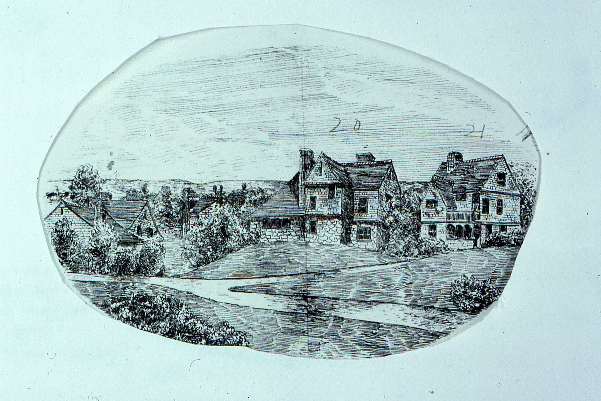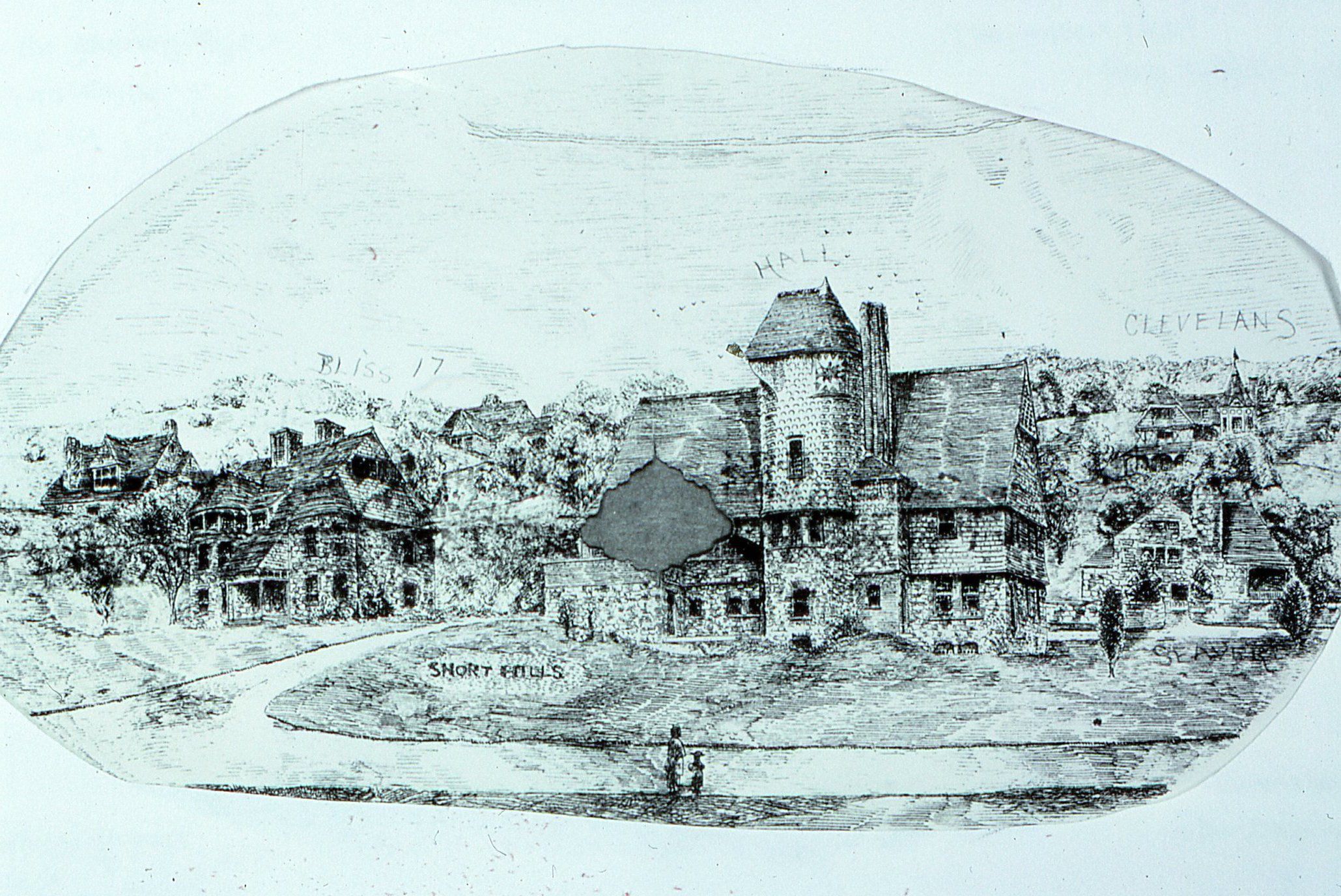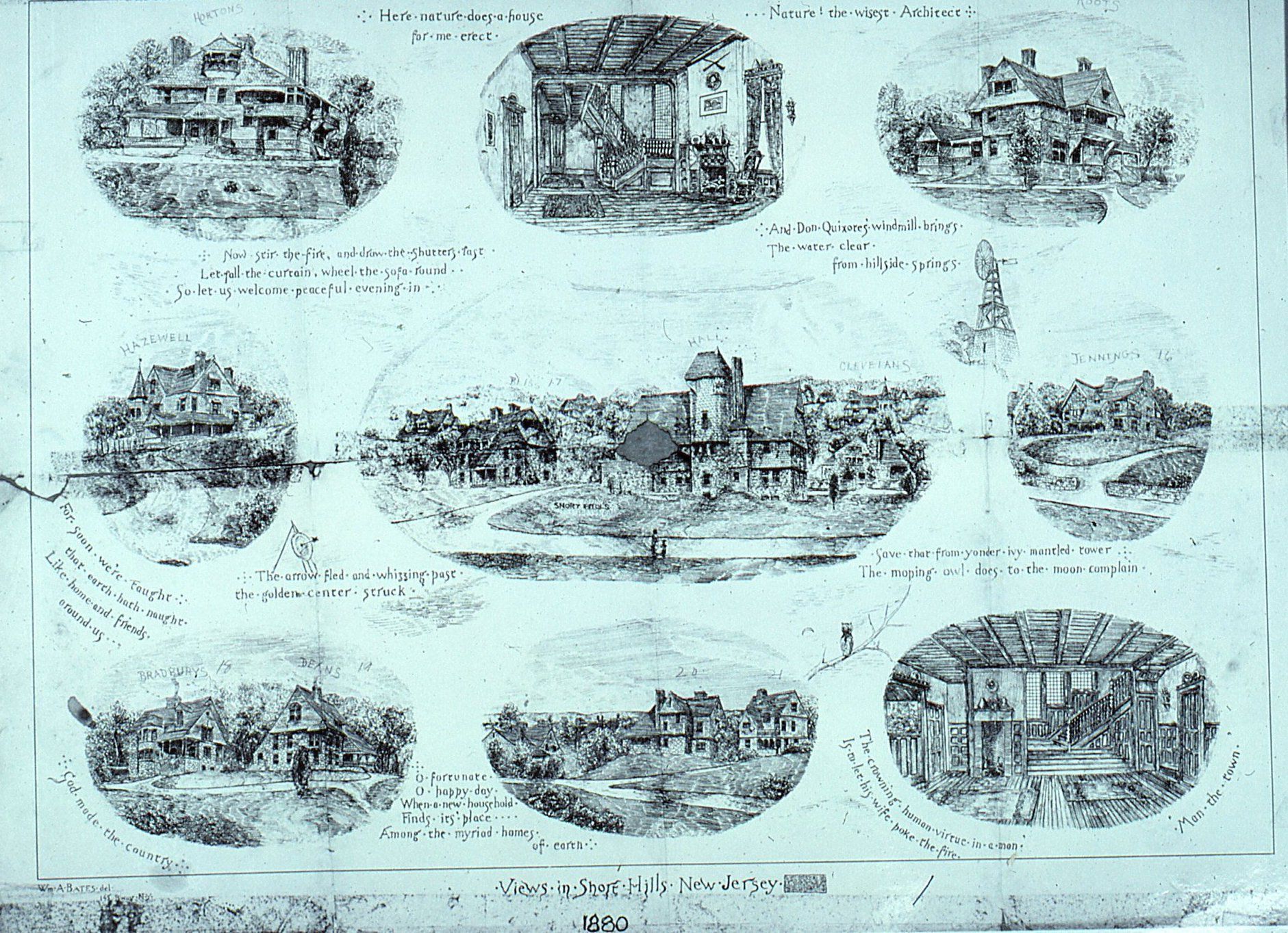 William A. Bates, Views in Short Hills, NJ, 1880. Print of series of houses in Short Hills created by architect William A. Bates. Original source of print unknown. Later appeared in Short Hills Club History. Print depicts some of the key buildings in Stewart Hartshorn's Short Hills Park development. Buildings are identified by owners, architects and or numbers. Numbered Hartshorn houses are included.