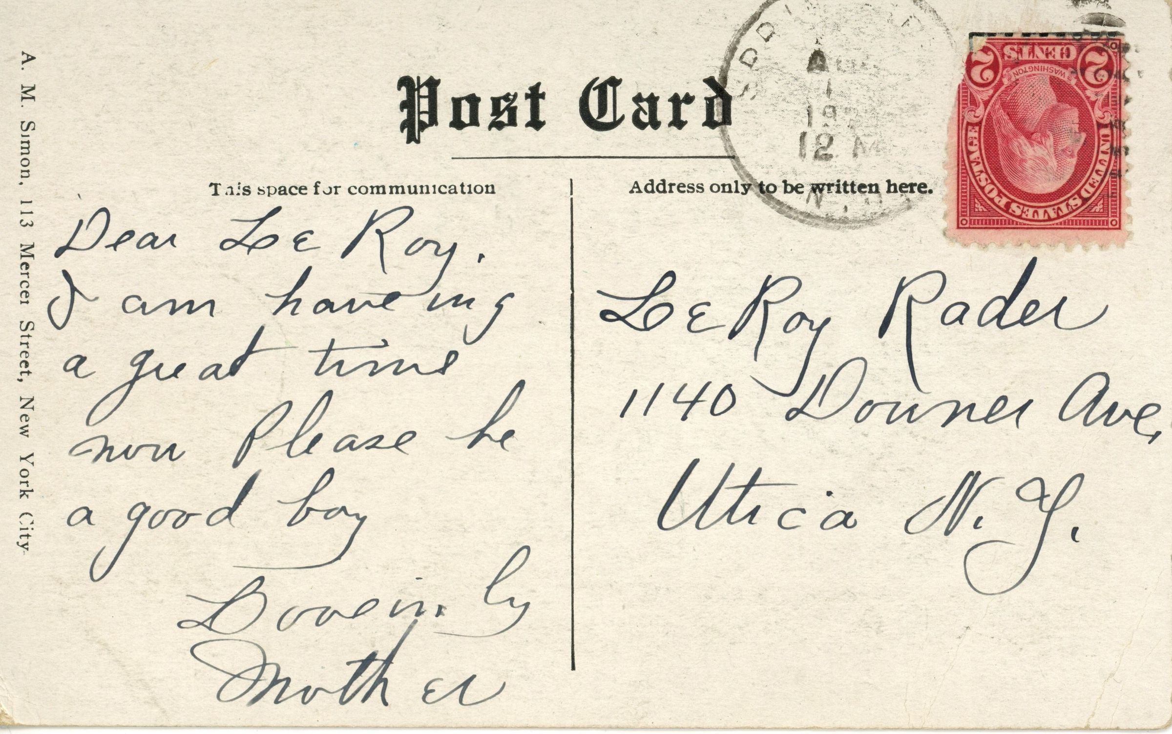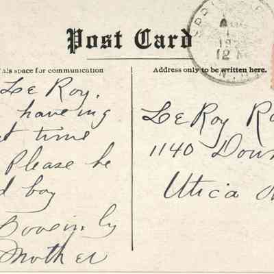 Postally used color postcard of the Cannon Ball House in Springfield postmarked Springfield, August (?) 192(?). The caption reads, "The house struck by cannon ball during Revolutionary War, Springfield, N.J." and is addressed to LeRoy Rader, 1140 Douner Ave., Utica, N.Y. Message reads, "Dear Le Roy, I am having a great time. Please be a good boy. Lovingly, Mother."Collection