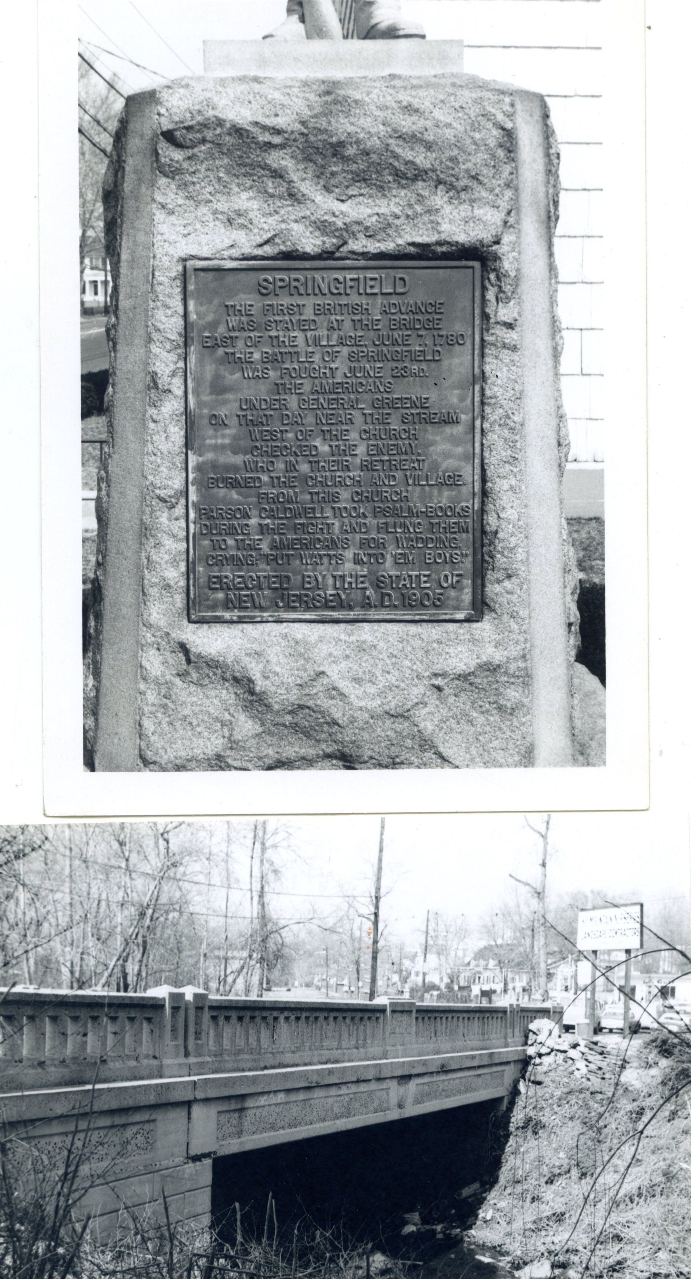 A monument describing the first British advance. The plaque reads "SPRINGFIELD - The first British advance was stayed at the bridge east of the village, June 7, 1780. The Battle of Springfield was fought June 23rd. The Americans under General Greene on that day near the stream west of the Church checked the enemy, who in their retreat burned down the Church and village. From the church Parson Caldwell took psalm-books during the fight and flung them to the Americans for wadding crying, 'put Watts into 'em boys.' Erected by the State of New Jersey, A.D. 1905." Below is the picture of the bridge where this all took place.Acquisition
