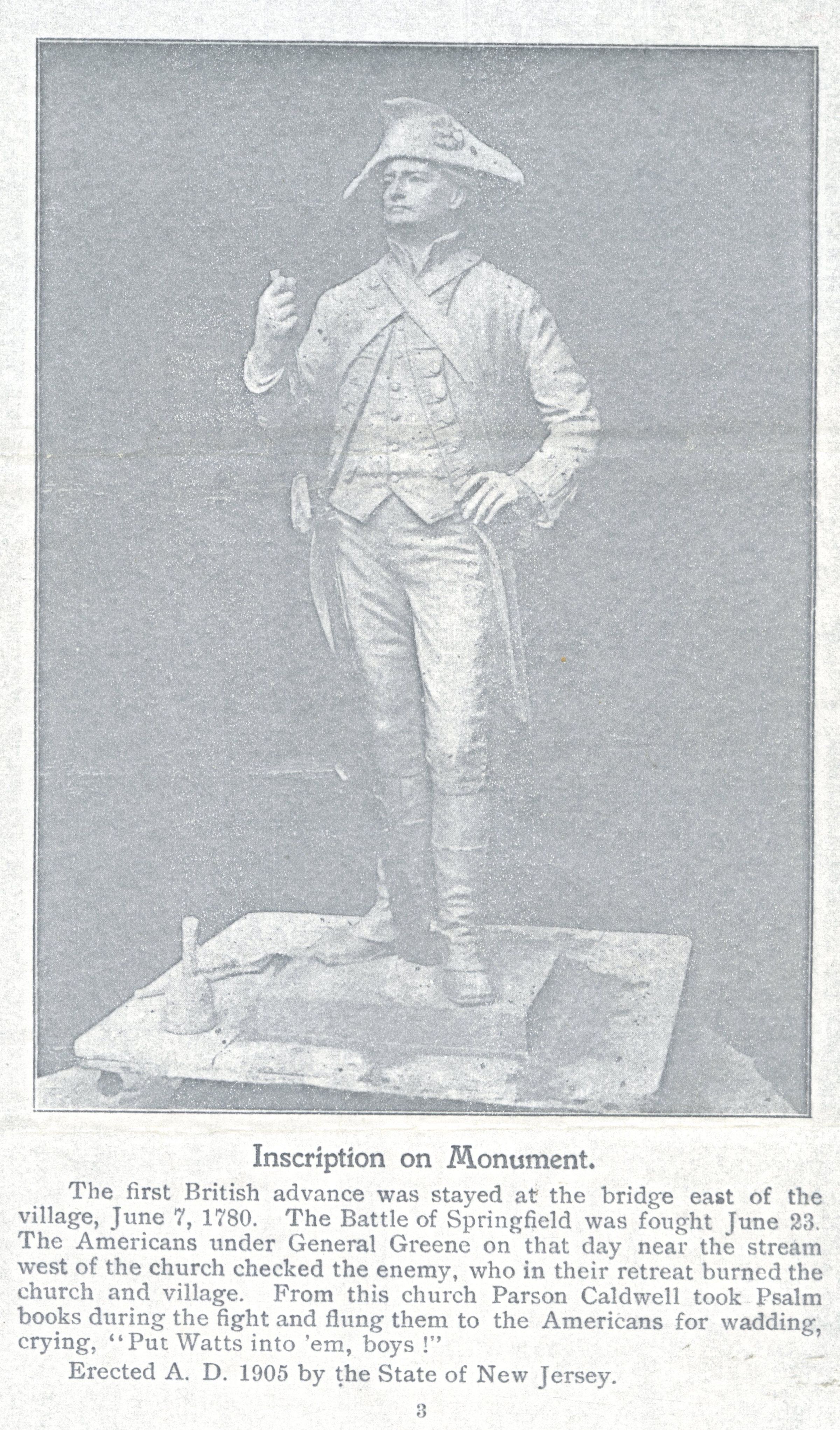 Inscription on Monument: The first British advance was stayed at the bridge east of the village, June 7, 1780. The Battle of Springfield was fought June 23. The Americans under General Greene on that day near the stream west of the church checked the enemt, who in their retreat burned the books during the fight and flung them to the Americans for wadding, crying "Put Watts into 'em boys!"Acquisition