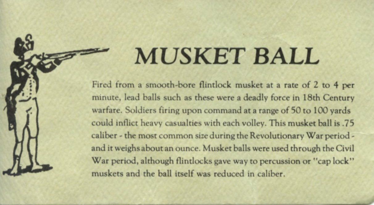 Reproduction Revolutionary War Musket Ball. 75 caliber lead ball such as those fired from a smooth-borne flintlock musket at a rate of 2-4 per minute.Acquisition