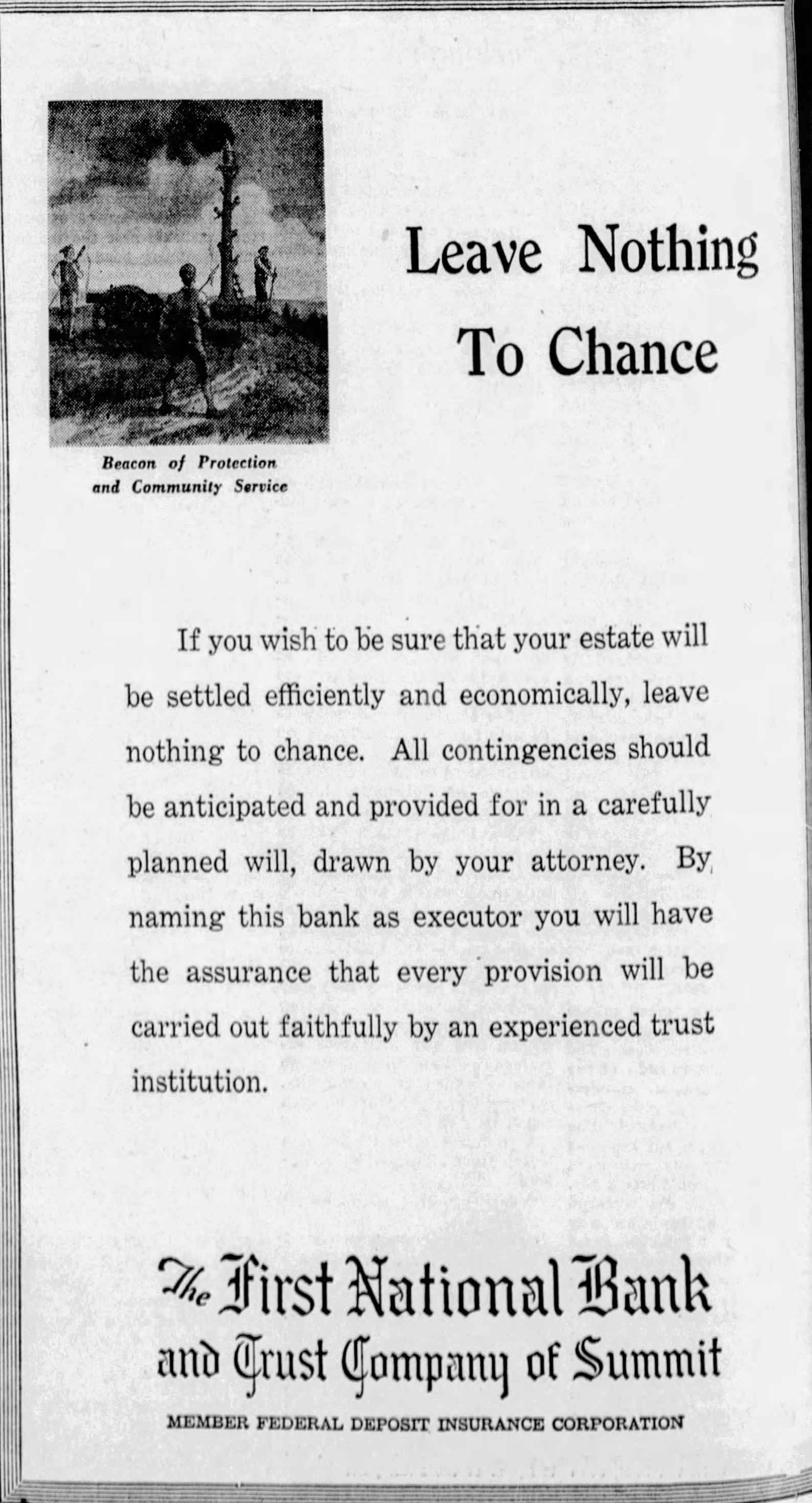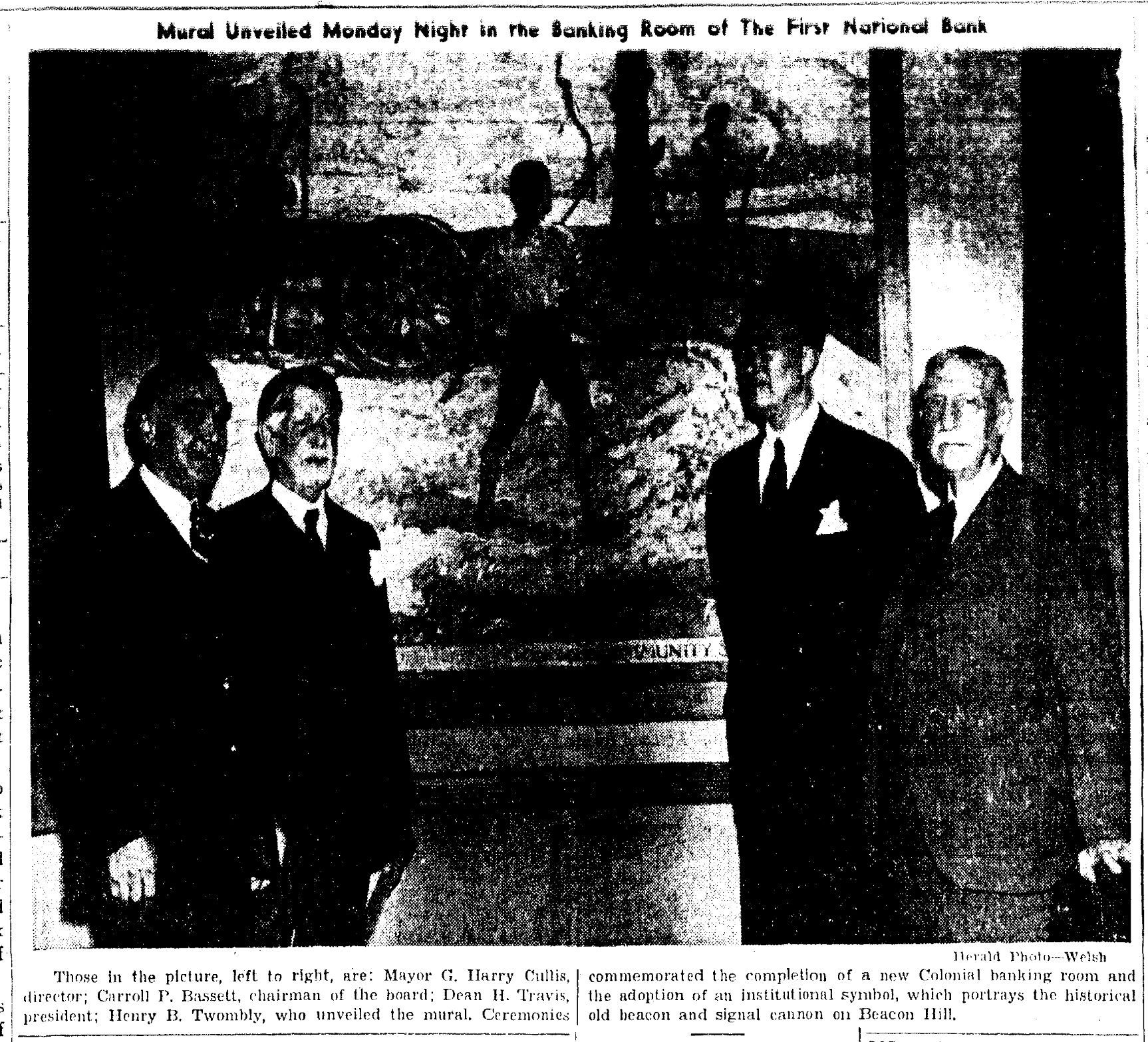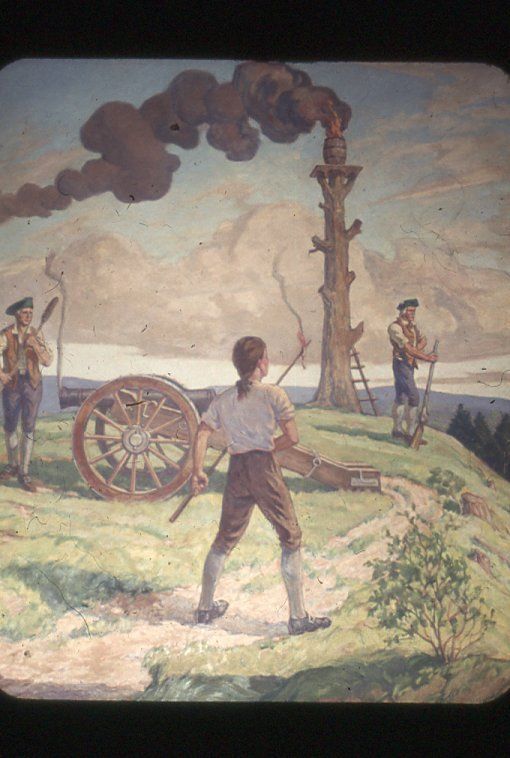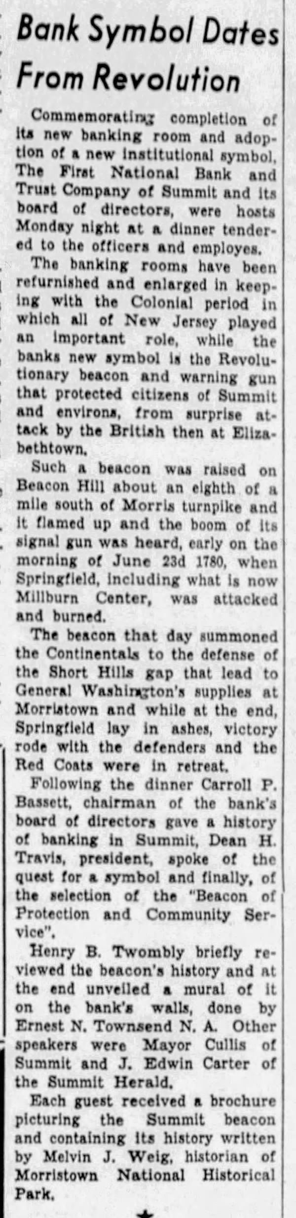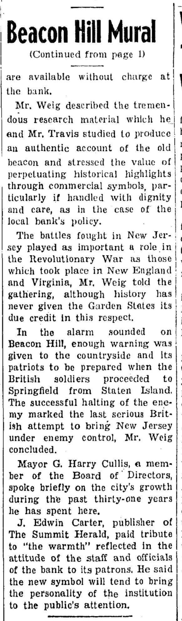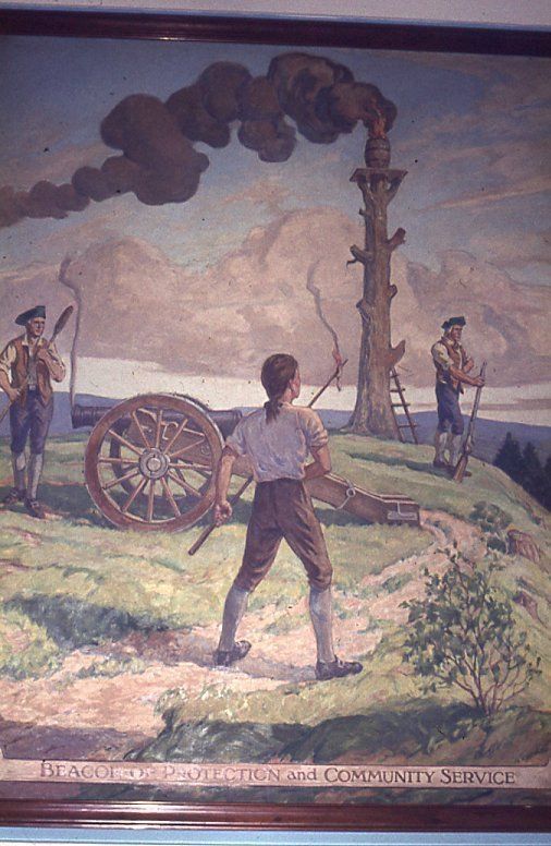 Photograph of Ernest N. Townsend's mural "Beacon of Protection and Community Service" depicting the Revolutionary War beacon painted in 1944 for The First National Bank and Trust Company of Summit (1 Maple Street). The photograph was taken by Harvey Reed in April 1975.Acquisition