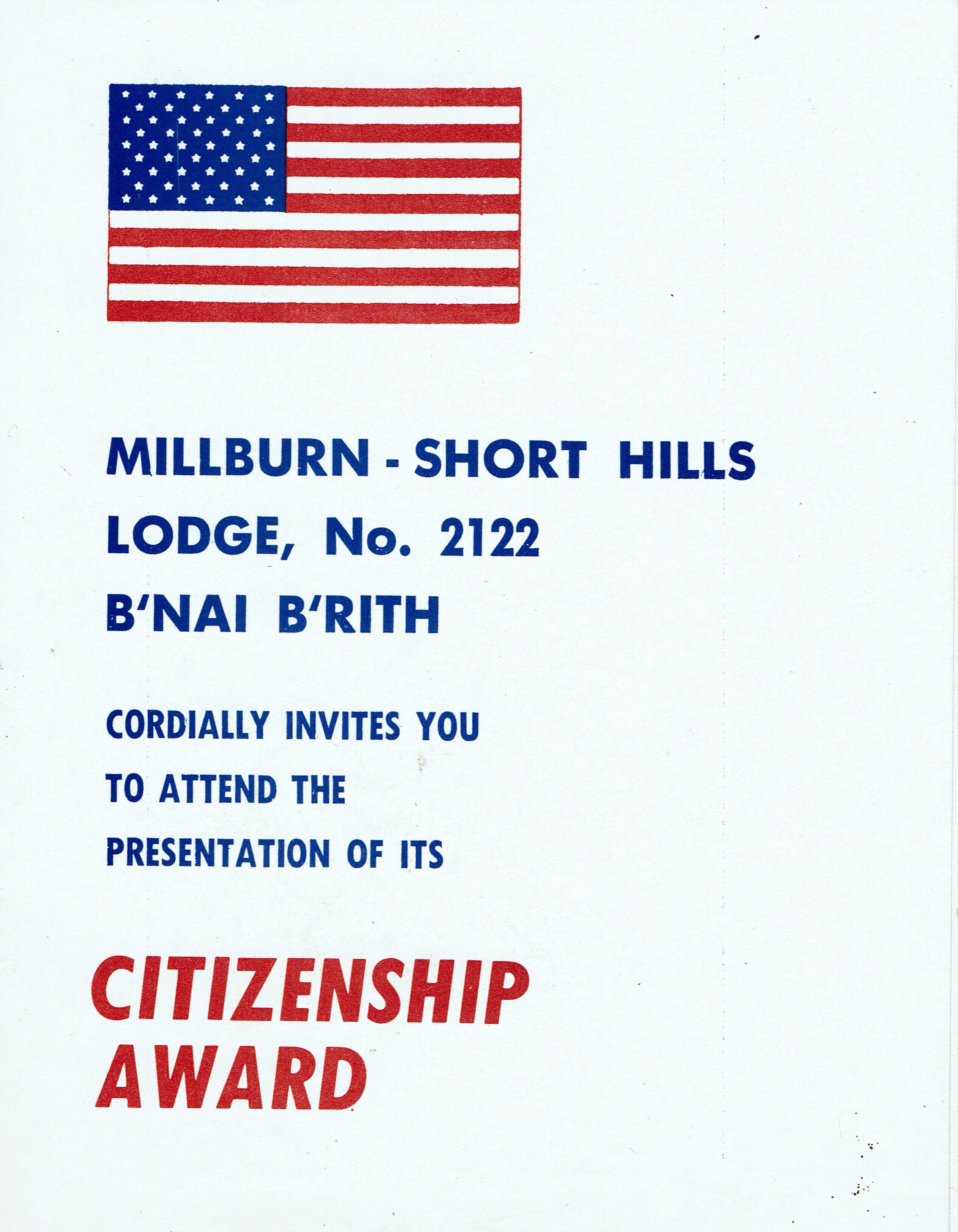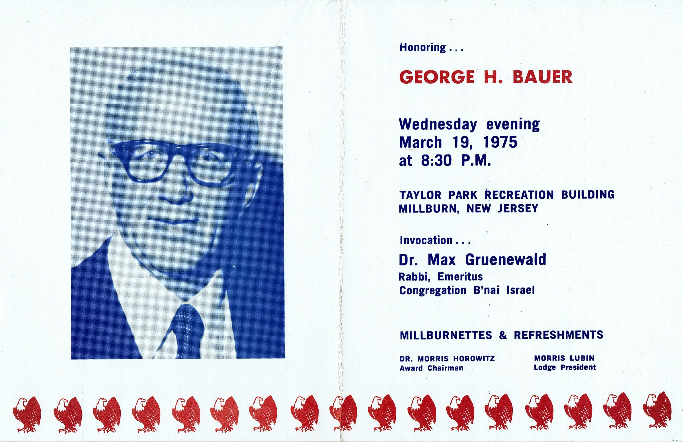Invitation to the Millburn-Short Hills Lodge, No. 2122 B'nai B'rith Citizenship Award Ceremony honoring George H. Bauer on Wednesday evening, March 19, 1975. The ceremony featured an invocation by Dr. Max Gruenwald, Rabbi Emeritus of Congregation B'Nai Israel. 4 pp.Acquisition