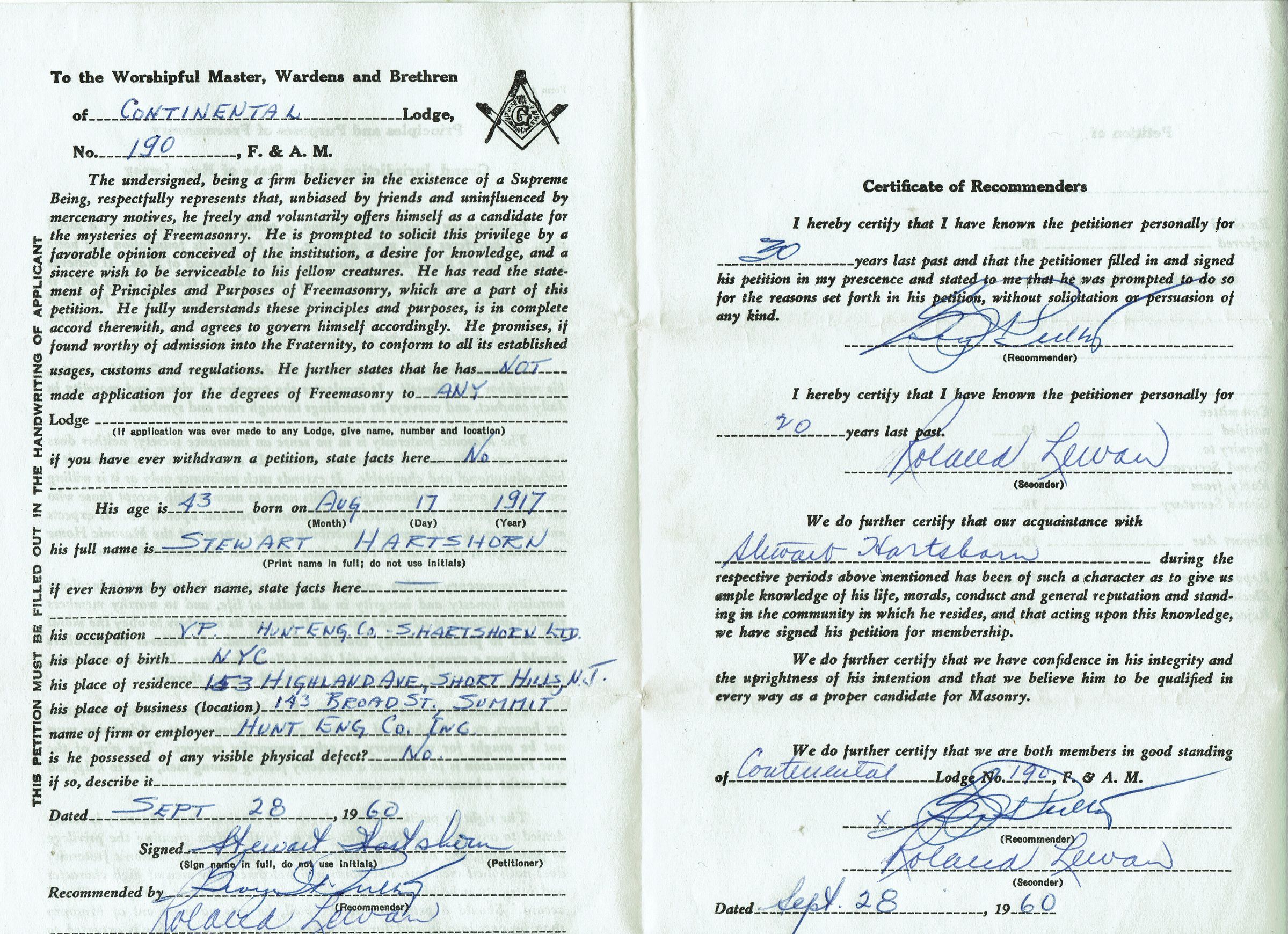 Application from Stewart Henry Hartshorn, Jr., to Freemason Lodge Number 190 on September 28, 1960. According to the application, Hartshorn was 43 years old (born August 17, 1917) and lived at 153 Highland Avenue in Short Hills. 4 pp.Acquisition