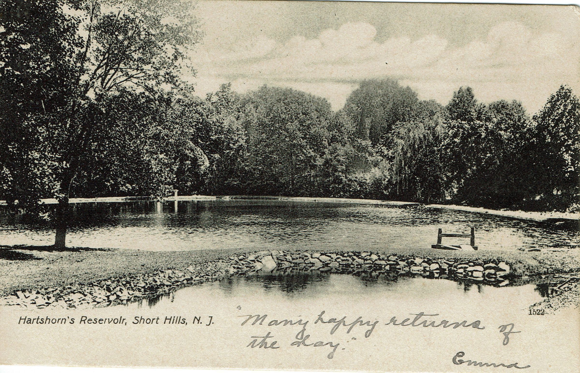 Postally used photographic postcard of Hartshorn's Reservoir, Short Hills. Postmarked Short Hills, August 15, 1907, 12 M, received New City, New York, August 16, 1907, 10 am. Card is addressed to Mr. L.G. Pfarre, New City, New York. Message on front reads: "Many happy returns of the day? Emma."Collection
