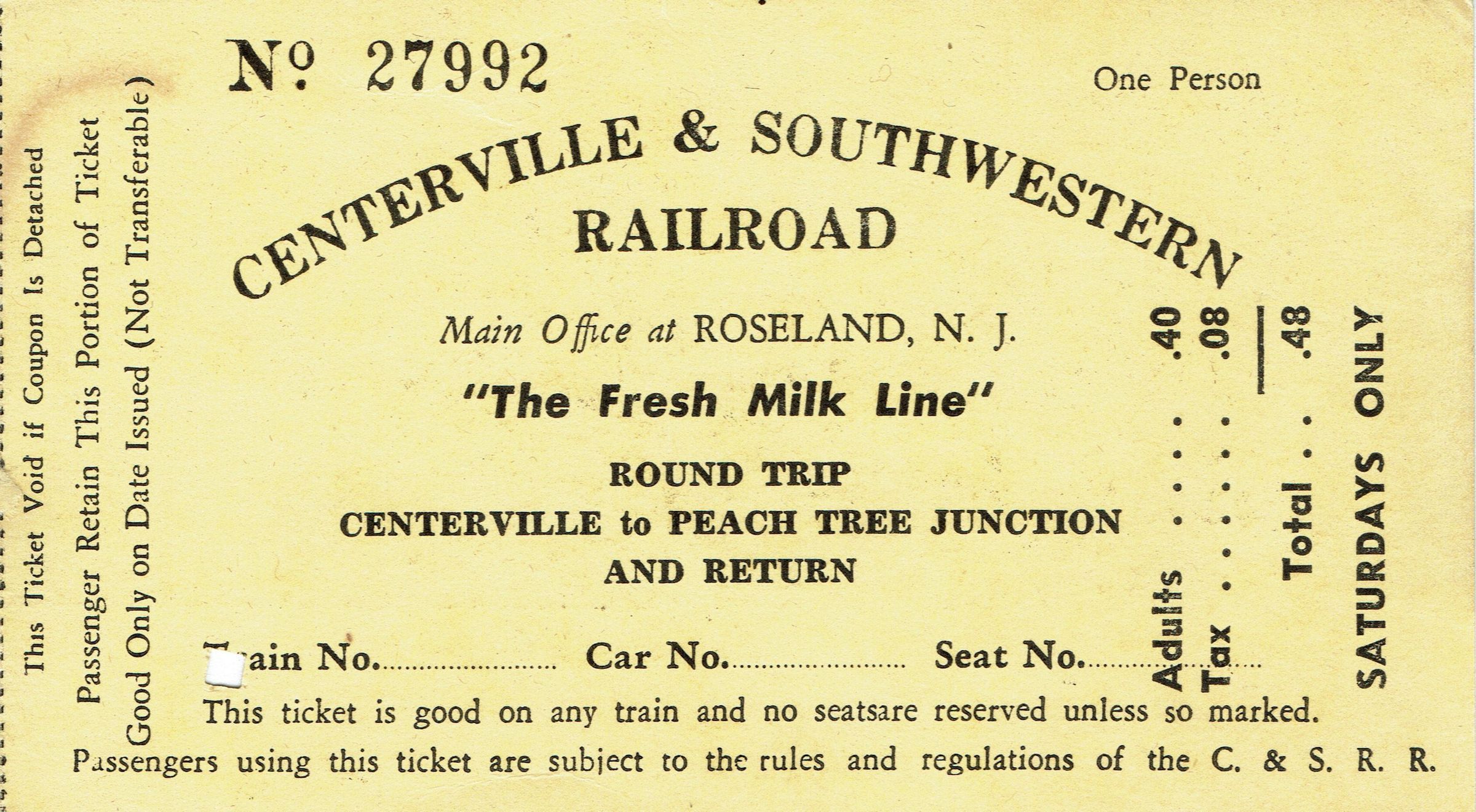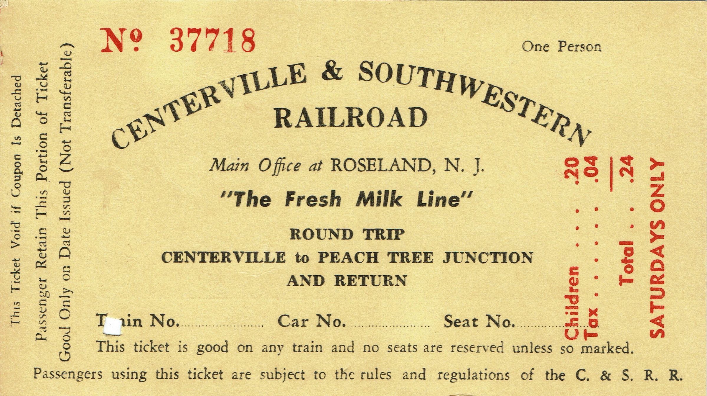 Pair of round trip tickets on the Centerville & Southwestern Railroad, "The Milk Line" from Centerville to Peachtree Unction servicing Henry Becker & Son's Dairy Farms at Roseland, N.J. According to Wikipedia:The Becker Farm Railroad (also known as the Centerville and Southwestern Railroad) was located on the Becker dairy farm in Roseland, New Jersey, US. This 2-inch scale, 9+7⁄16 in (240 mm) gauge miniature railway, the brainchild of Eugene Becker, dates to 1938. The first revenue trips were in the late 1940s. At full operation, the railroad ran on Saturdays until 5 pm between the beginning of May and the end of October and on Wednesdays during July and August. The farm closed and the railroad was dismantled in 1972. These tickets date to the 1950s-early 1960s, before the price increase at the end of the 1960s.