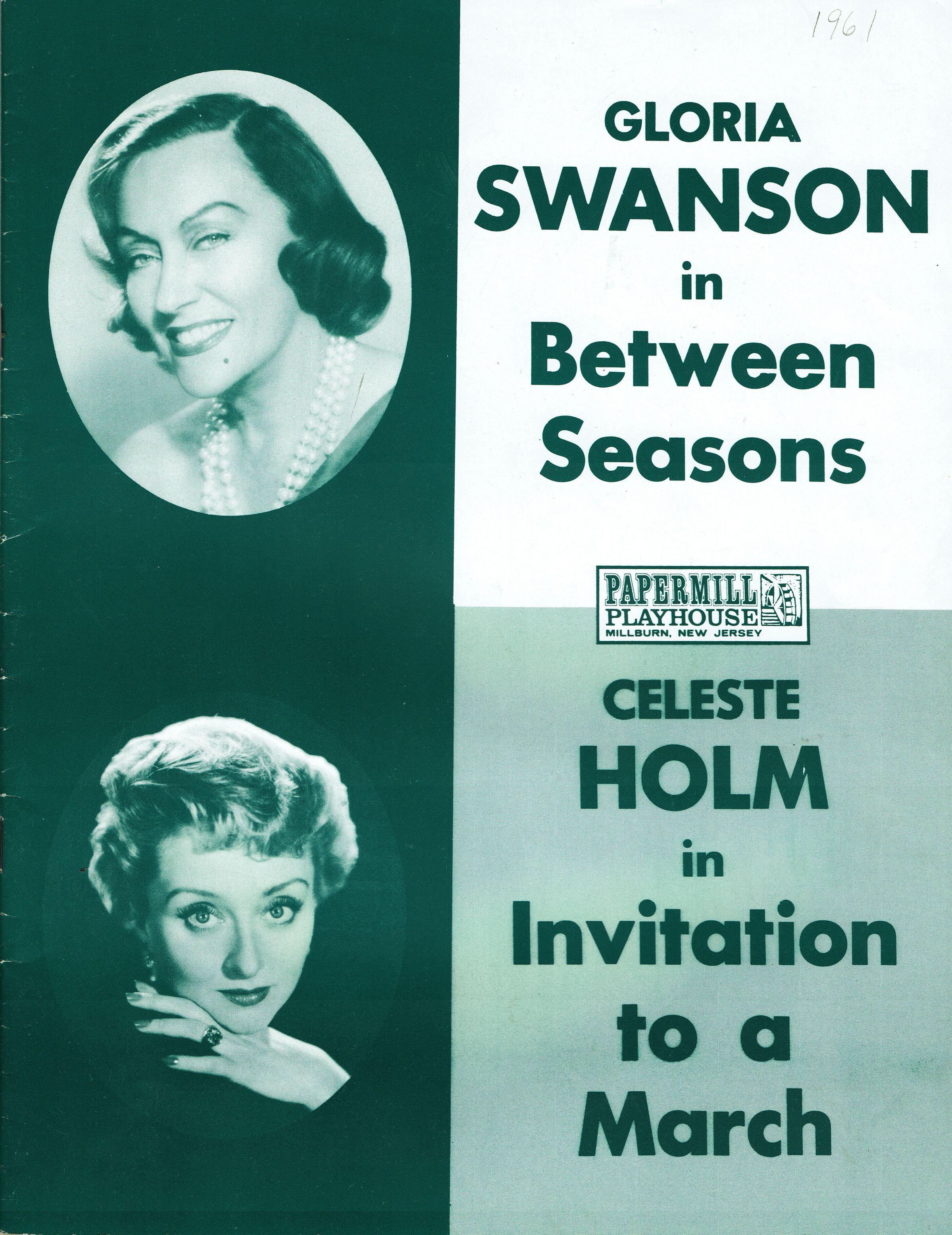 Souvenir Program for 1961 Paper Mill Playhouse Productions of "Between Seasons" with Gloria Swanson (July 24-August 5) and "Invitation to a March" with Celeste Holm (August 7-August 12). Deluxe fully illustrated program with photographs of cast members, producers and articles about Paper Mill Playhouse. 20 pp. (Unpaginated)