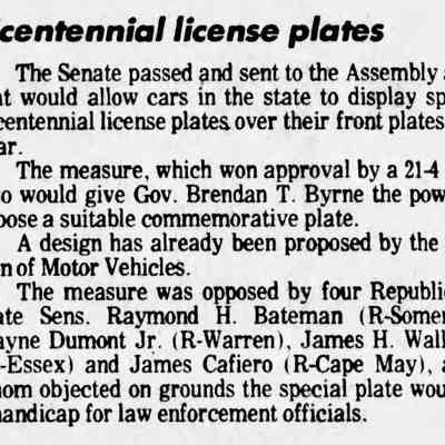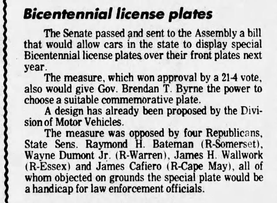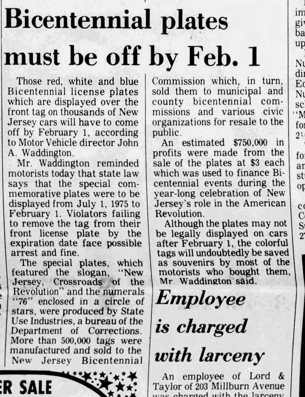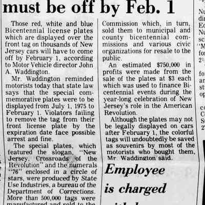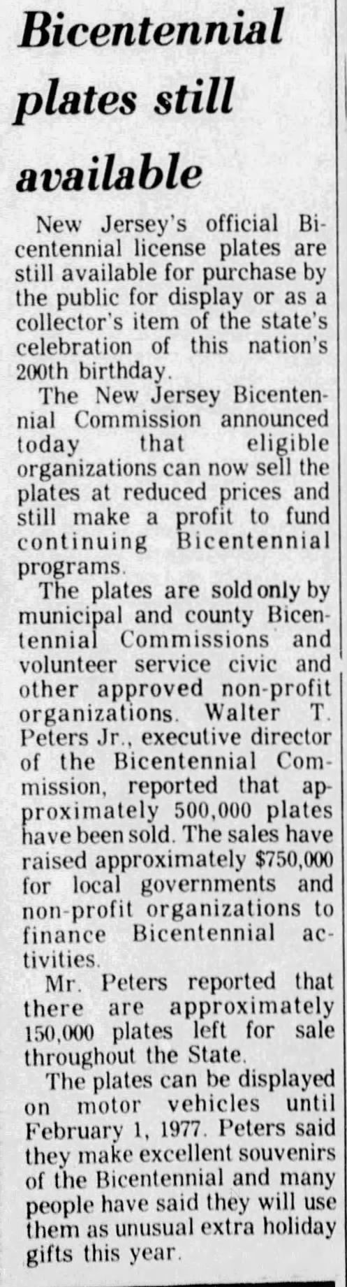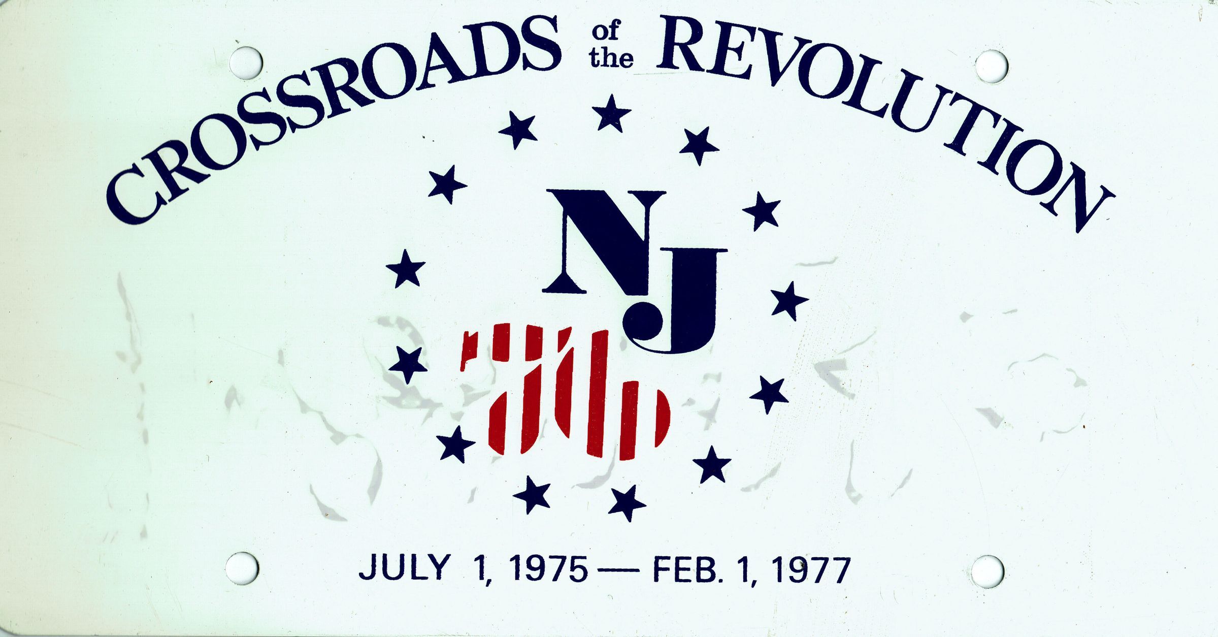 Souvenir License Plate produced for the US Bicentennial Celebrations in New Jersey 1975-1977. The Senate passed a bill allowing cars to display special commemorative license plates in New Jersey in February 1975. The official design, which has Crossroads of the Revolution in an arch at the top and features 13 5 pointed stars in a circle with NJ 76 in red, white and blue also contains the dates that the plate was valid (July 1, 1975-February 1, 1977). The plates were allowed to be displayed on the front of the vehicle and over the regular front license plate.