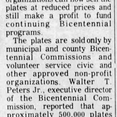 They were available for purchase thorough nonprofit organizations or official local and county bicentennial committees for $3.00. Proceeds from the sale of license plates were used to fund events during the bicentennial year.Acquisition