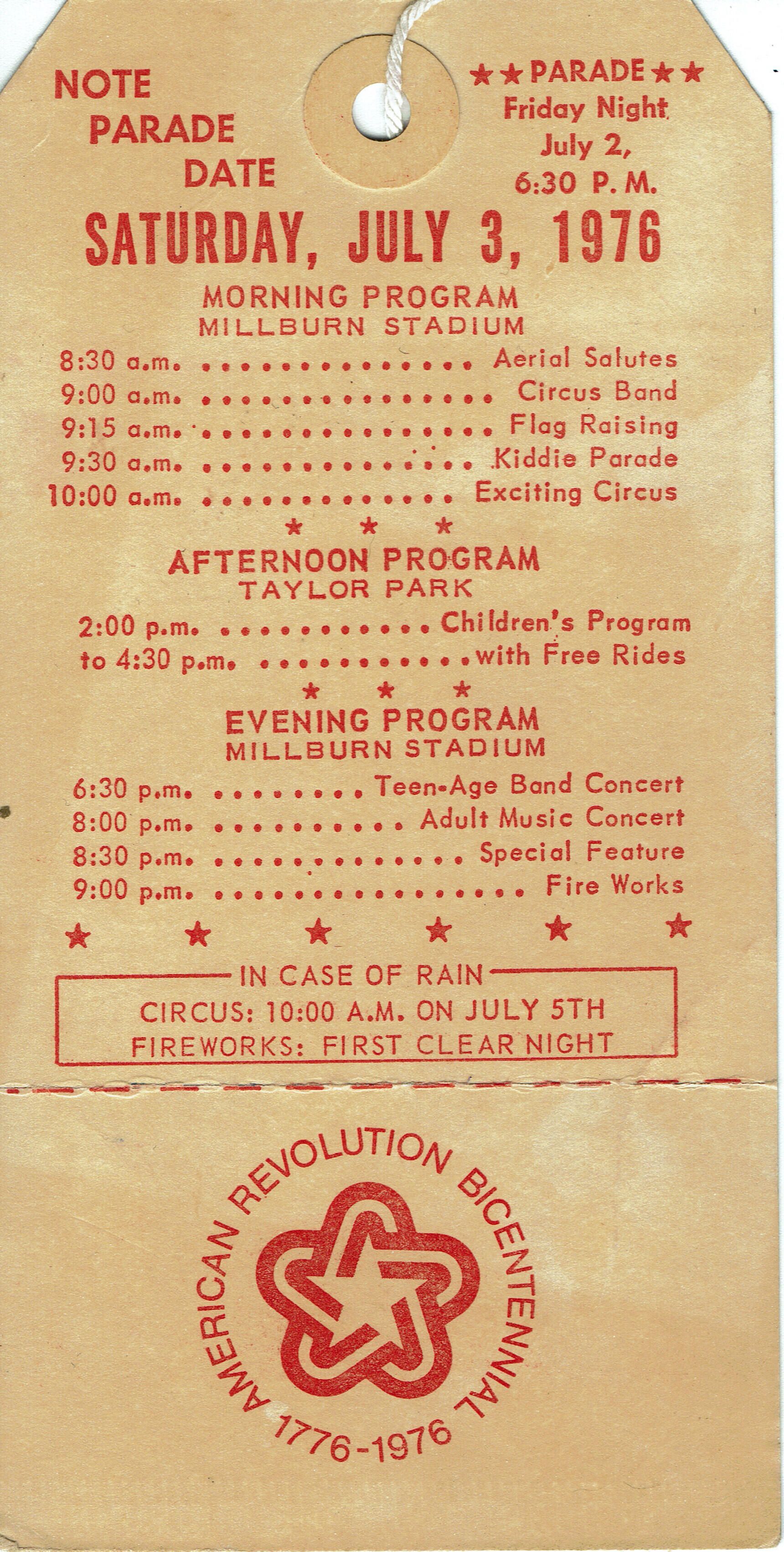 Tag for the Bicentennial July 4th Celebration in Millburn. Saturday, July 3, 1976. Verso contains schedule of events. Tags would purchased & worn to allow entry to various events of the day.