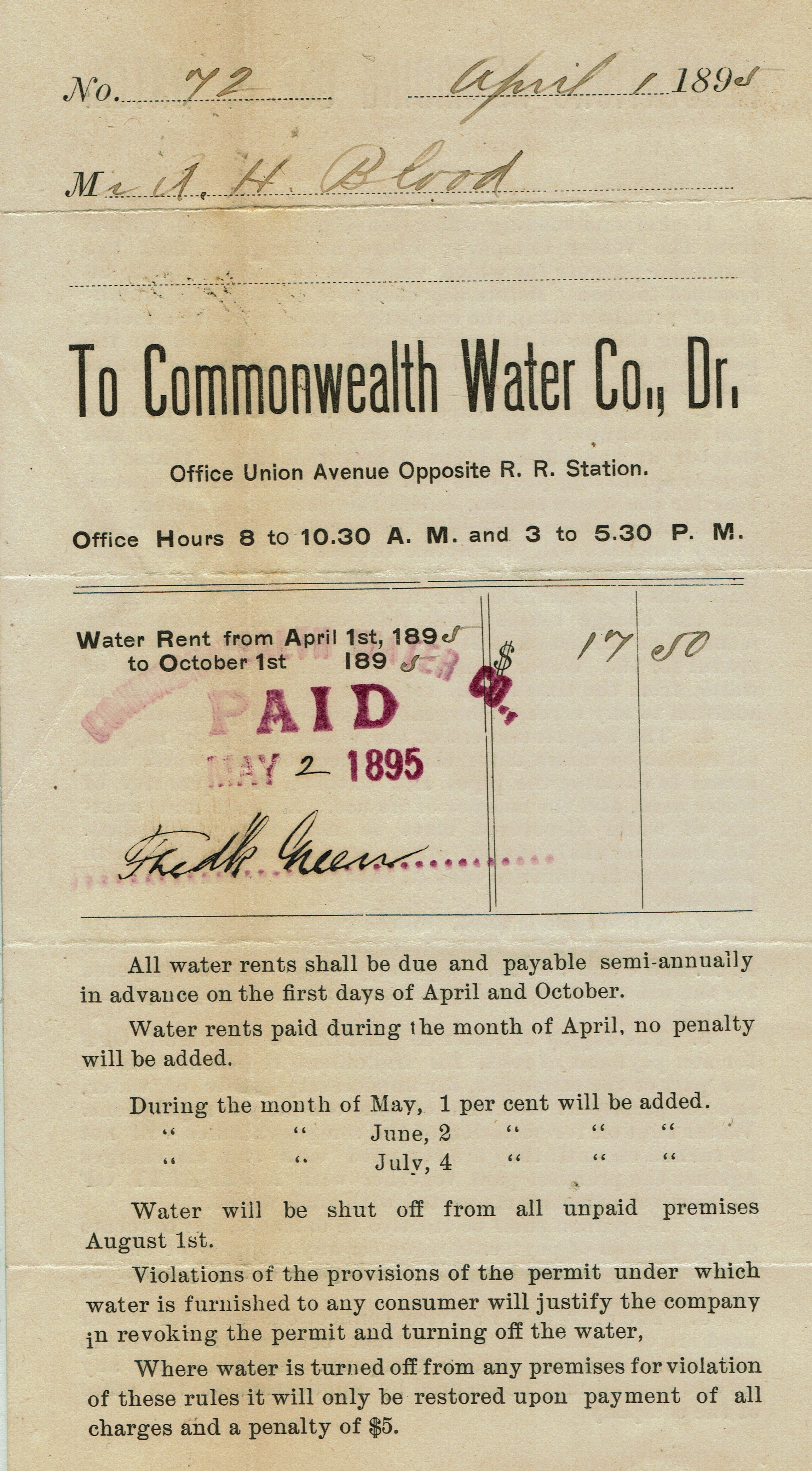 Blood Estate: Commonwealth Water Company Receipts, 1894 & 1895Entry/Object ID