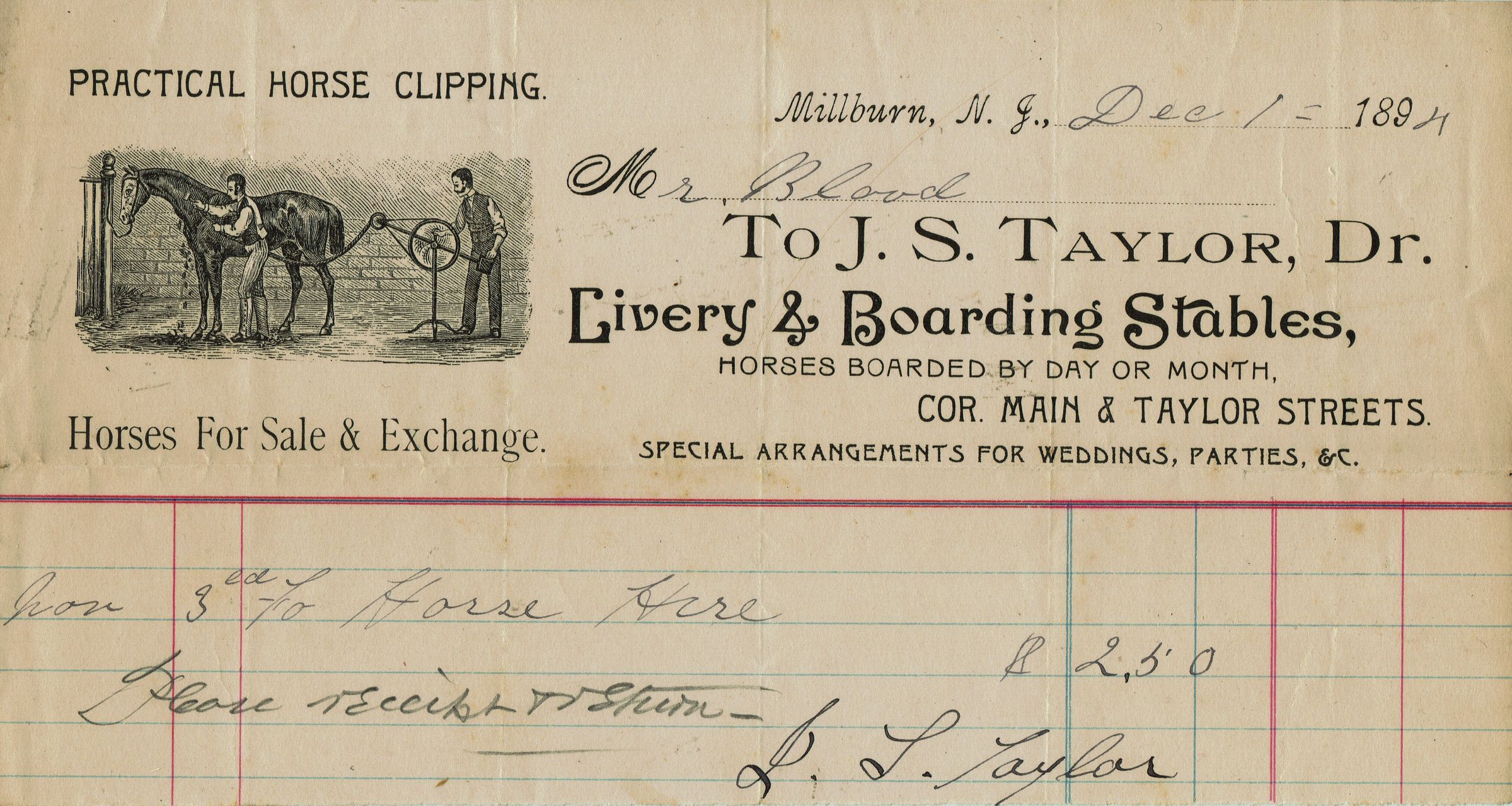 Blood Estate: J.S. Taylor, Dr. Livery and Boarding Stables Receipts, 1894Entry/Object ID