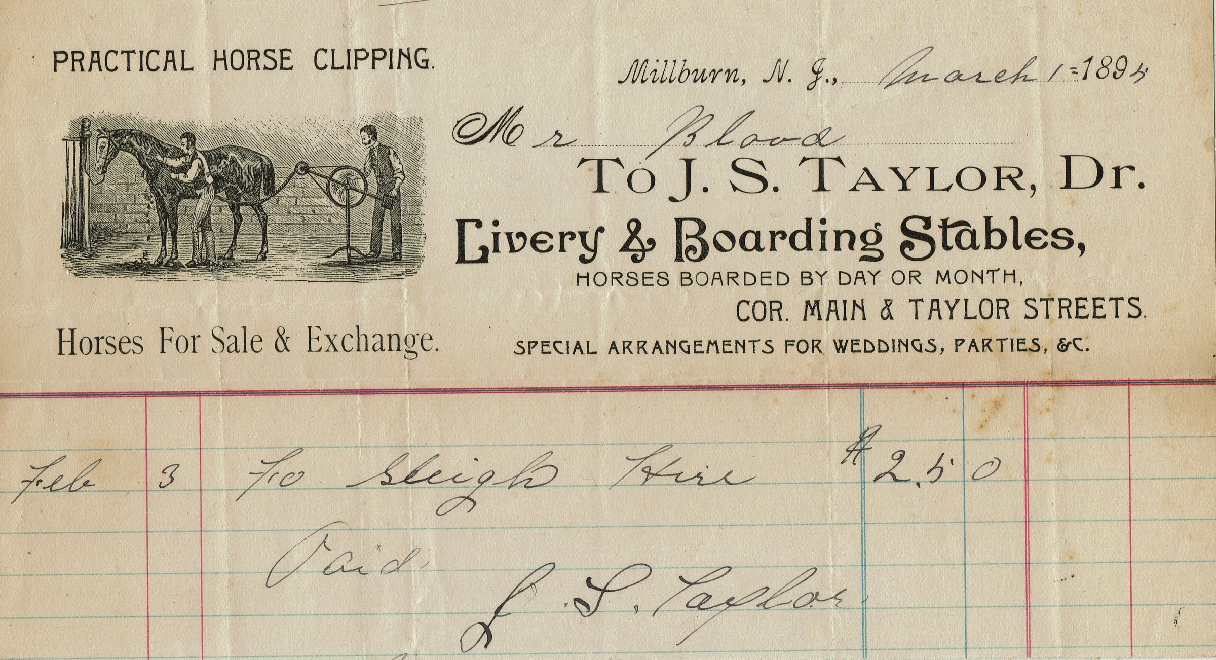 Receipts from J.S. Taylor, Dr. Livery & Boarding Stables, corner of Main & Taylor Streets, Millburn for Sleigh Hire on February 3, 1894 and Horse Hire on November 3, 1894.Collection