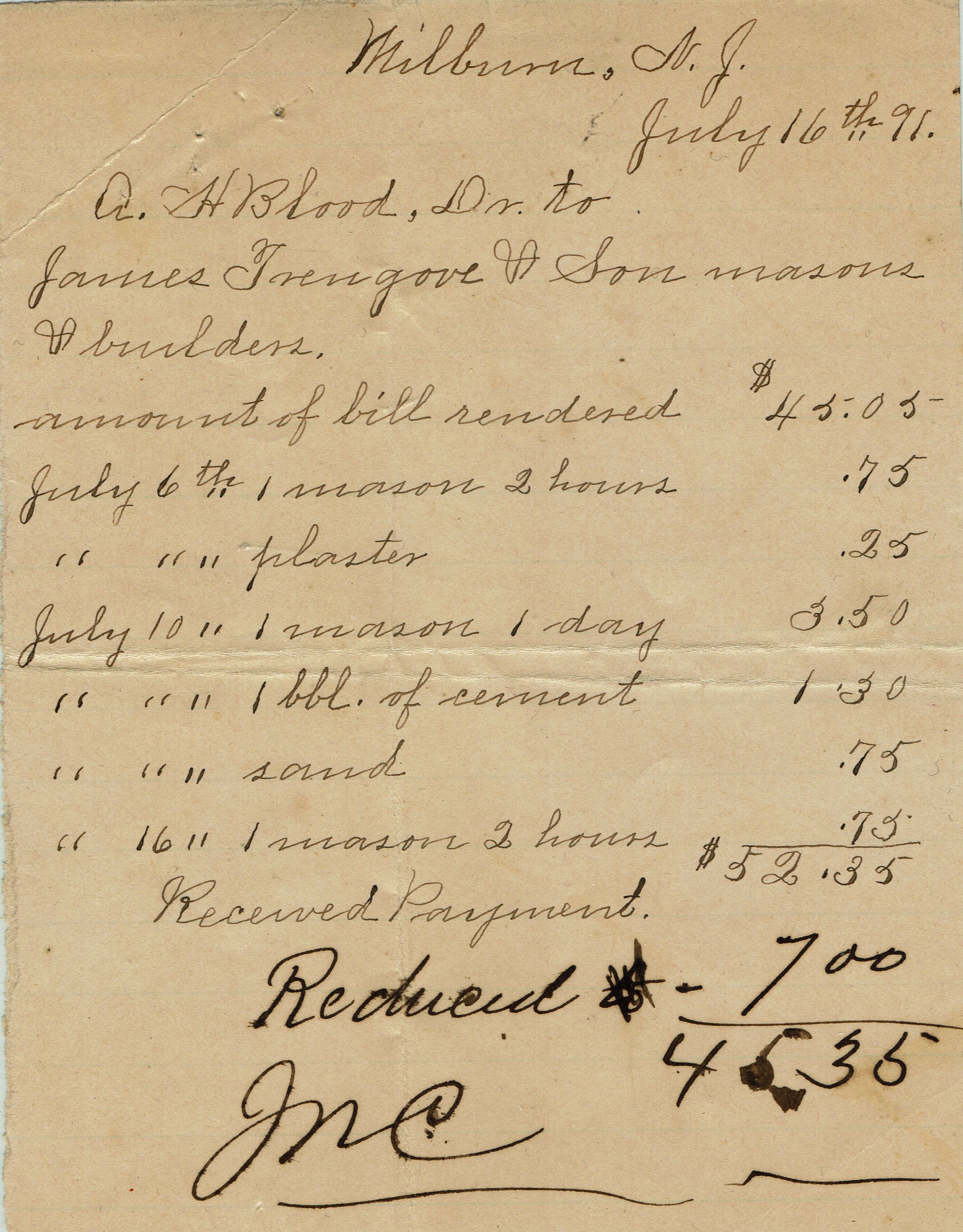 Blood Estate: James Trengove & Sons Masons & Builders receipt, July 1891Entry/Object ID