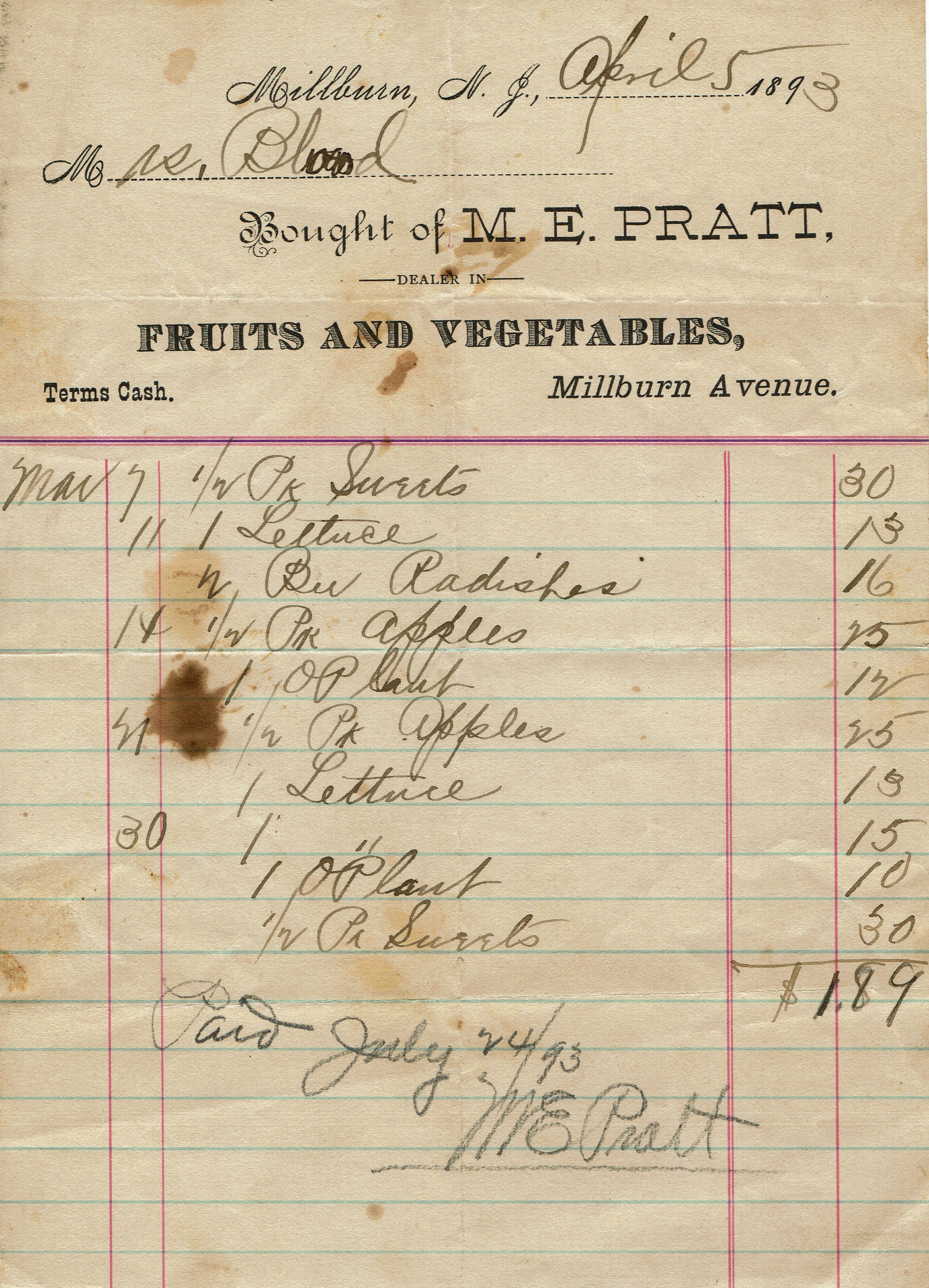 Receipt from M.E. Pratt, Dealer in Fruits and Vegetables, Millburn Avenue for Mrs. Blood (Ella Maria Farrington Blood, 1857-1935) dated Millburn, NJ, April 5, 1893. Handwritten list marked paid July 24/93 and signed ME Pratt.Collection
