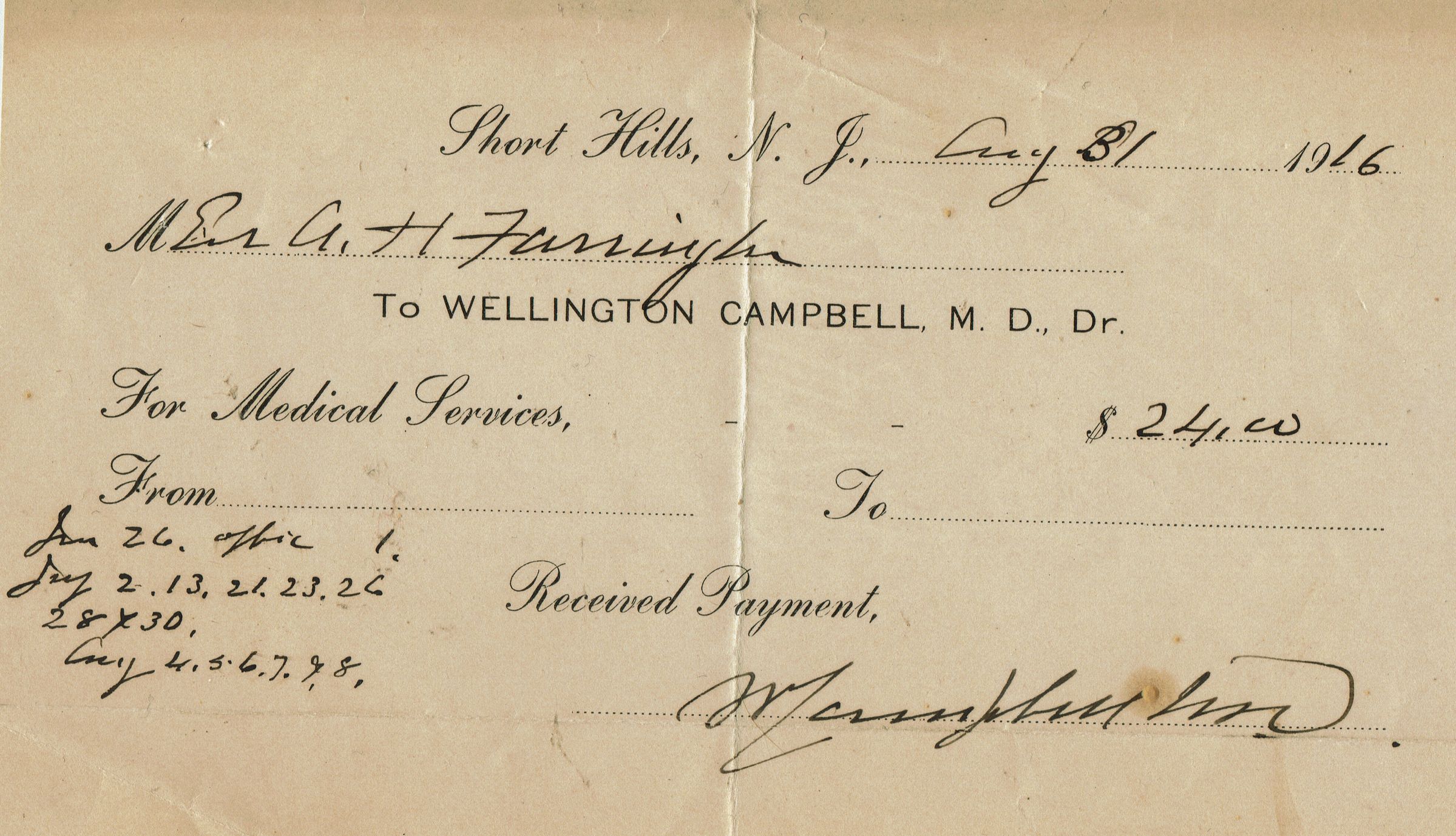 Receipt to Mr. A.H. Farrington for medical services from June-August 1916 dated Short Hills, N.J. August 31, 1916 and signed by Wellington Campbell.Collection