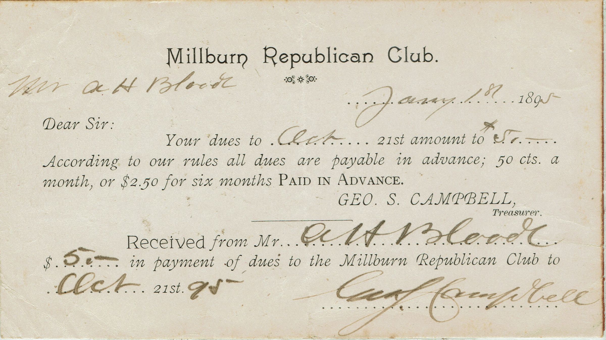 Receipt for Mr. A.H. Blood's payment of membership dues to the Millburn Republican Club dated January 1, 1895. Payment was $5.00 for membership until October 21, 1895. Receipt is signed by Millburn Republican Club Treasurer, George S. Campbell.Collection
