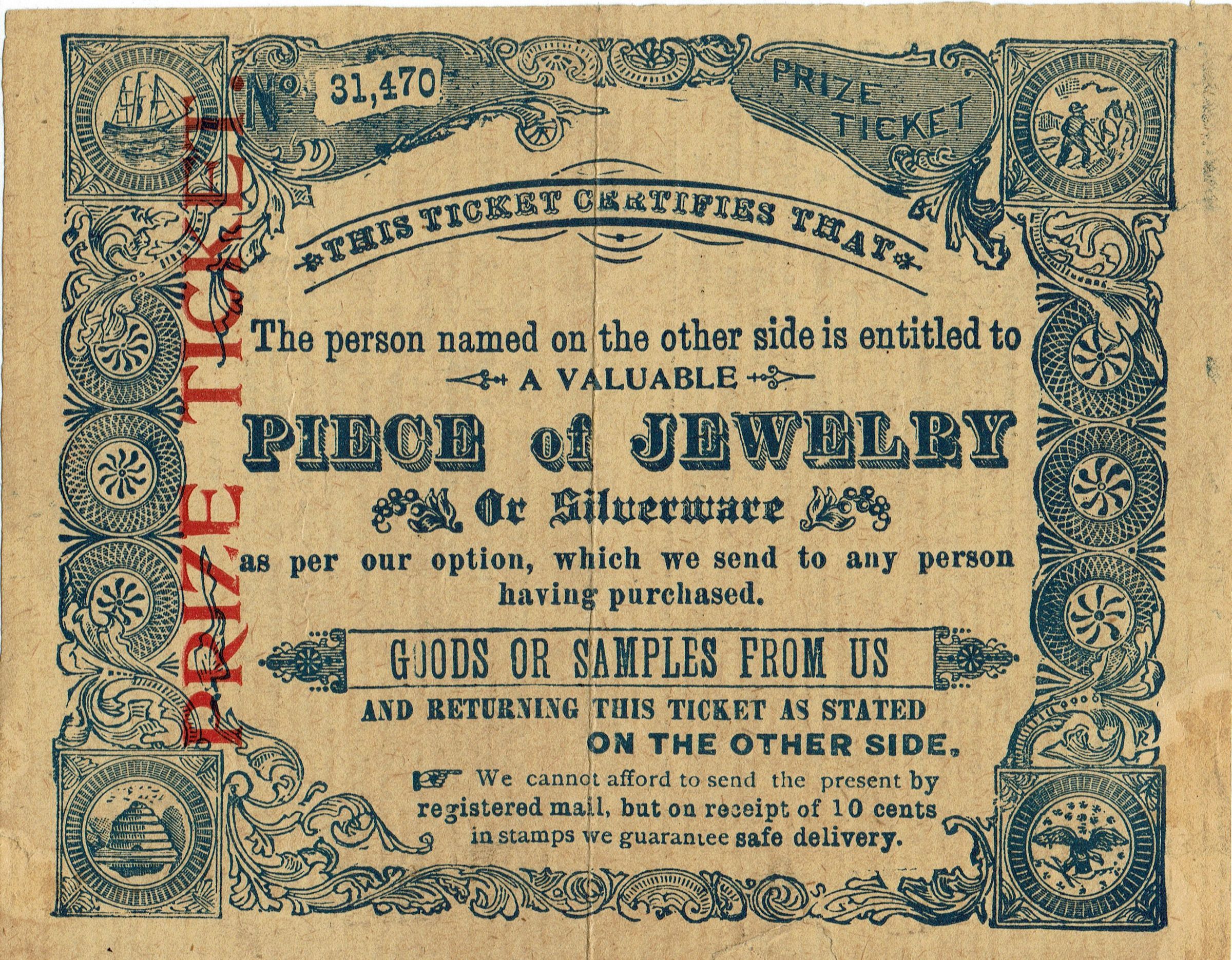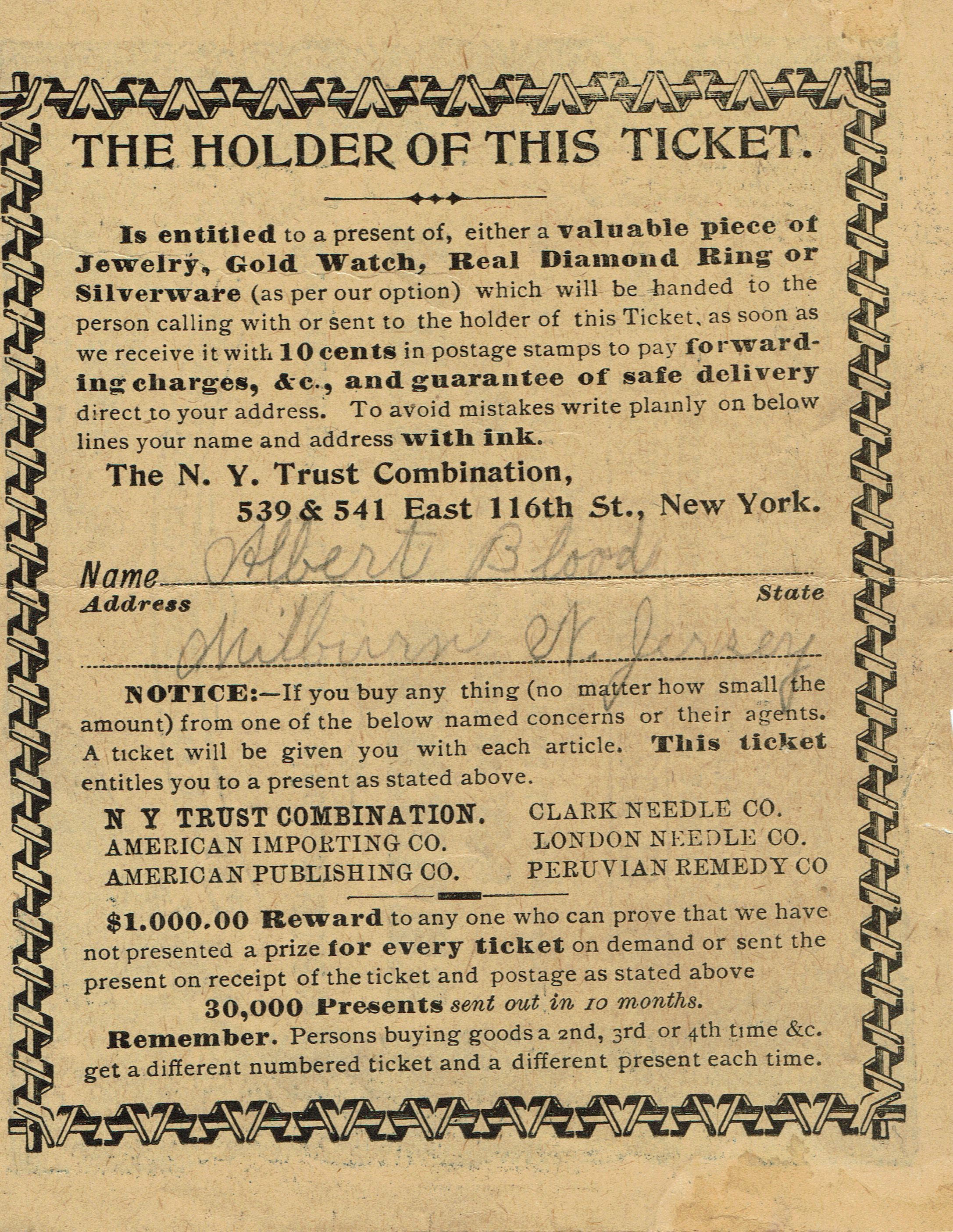 Prize ticket for a piece of jewelry or silverware for Albert Blood from the New York Trust Corporation.