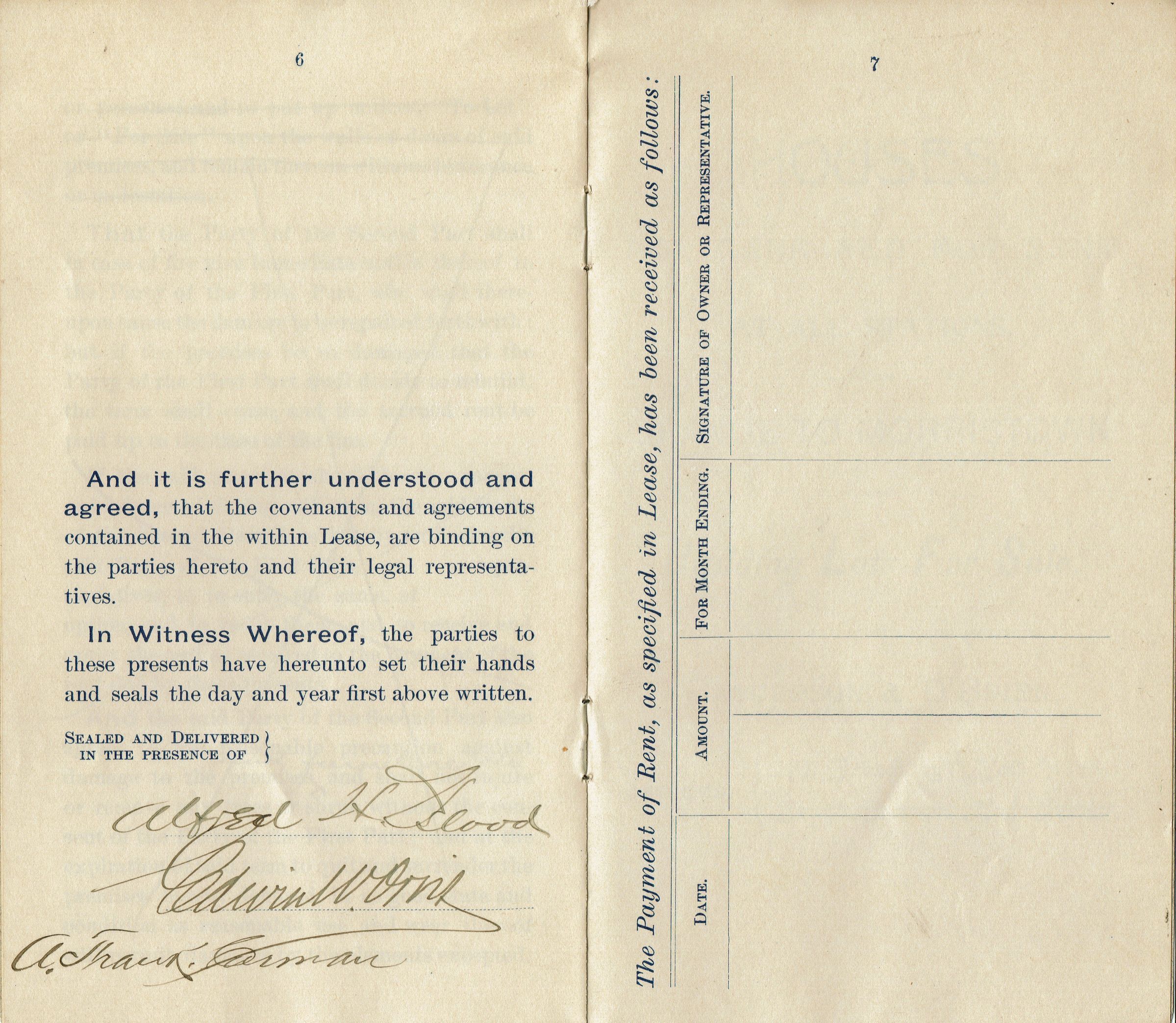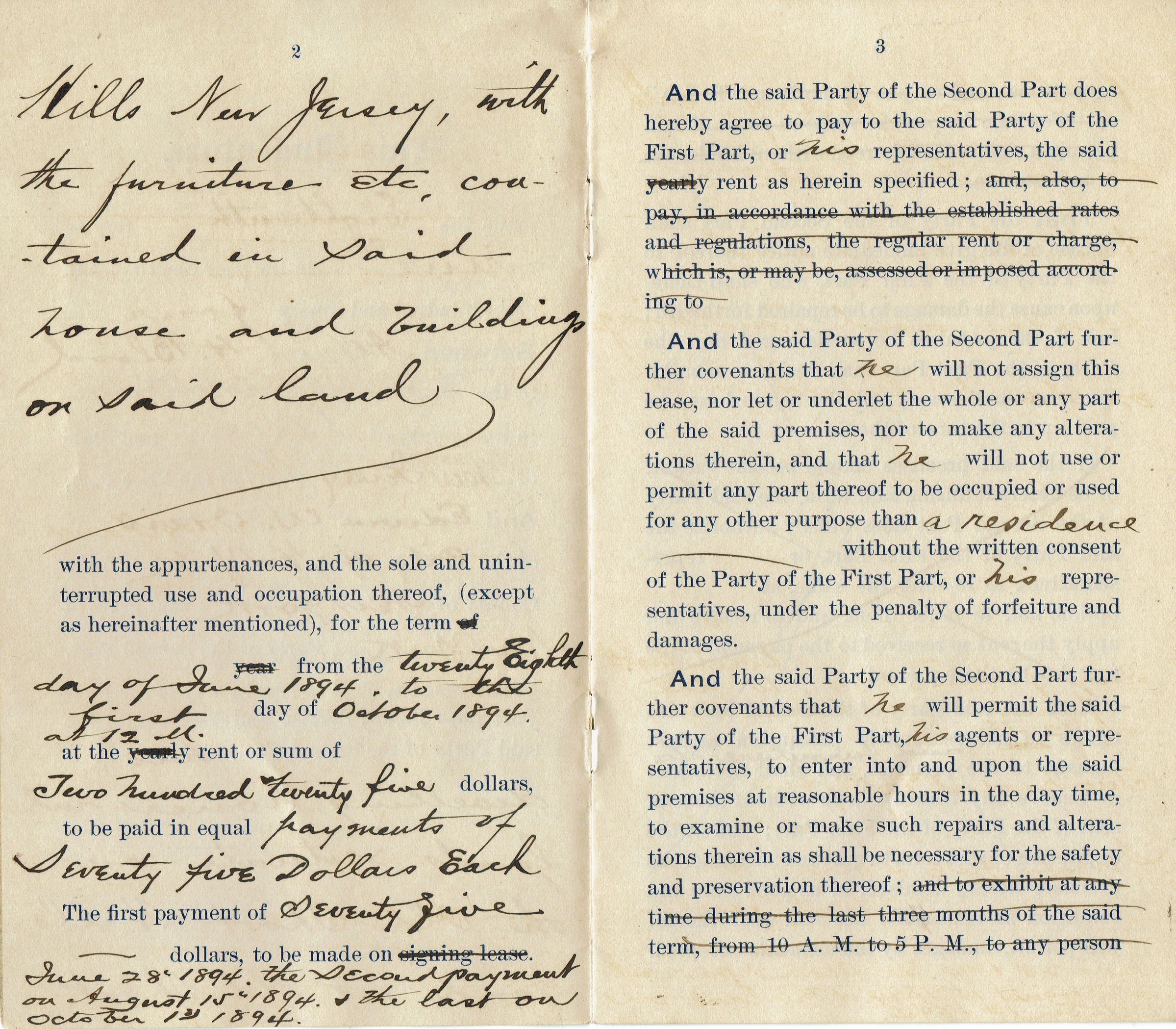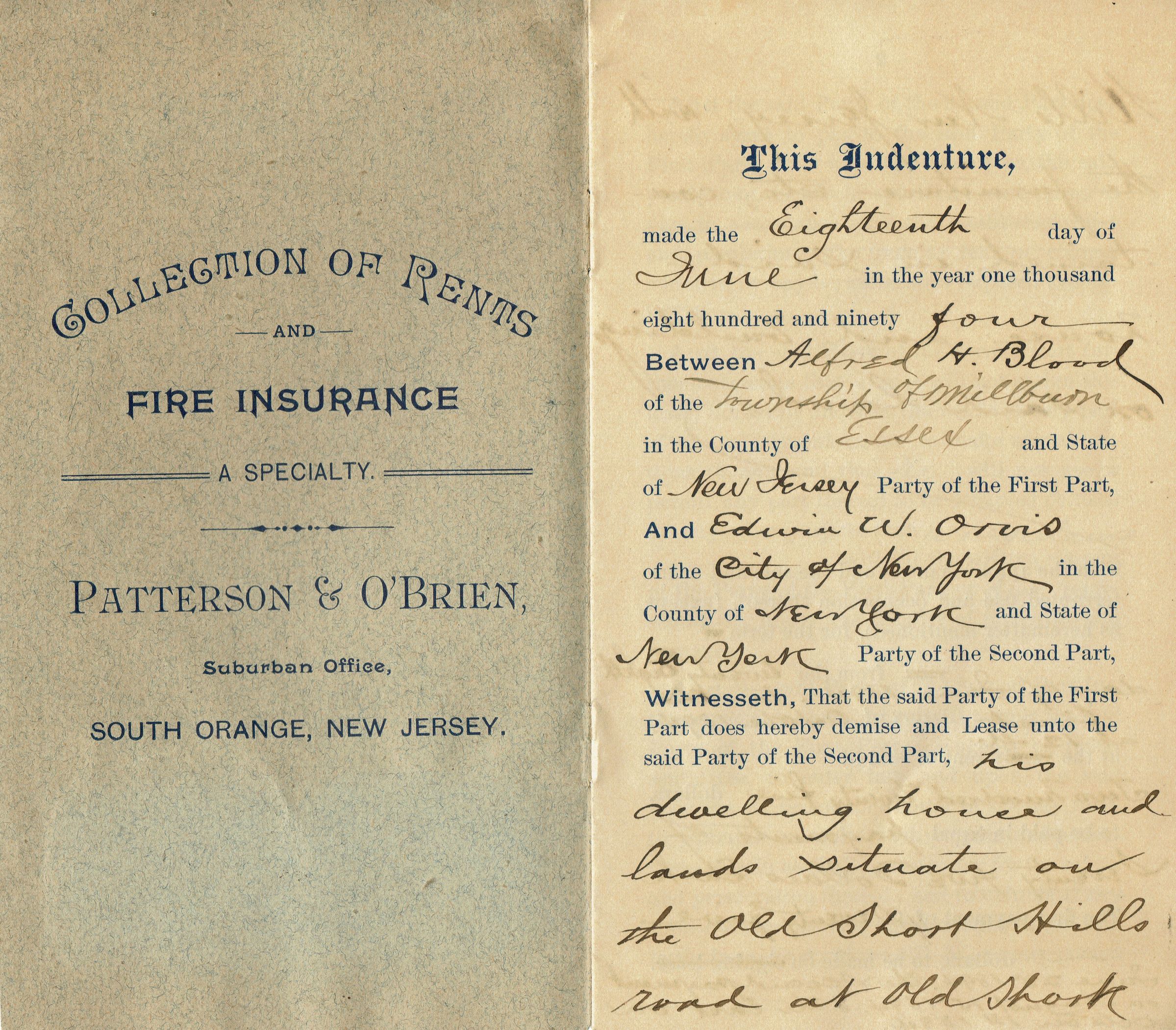 Eight-page lease for Alfred H. Blood's dwelling house and lands situated on the Old Short Hills Road at Old Short Hills, NJ with the furniture, etc., contained in the house and land to Edwin W. Orvis from June 28, 1894 to October 1, 1894. The rental fee for that period was $225.00.Collection
