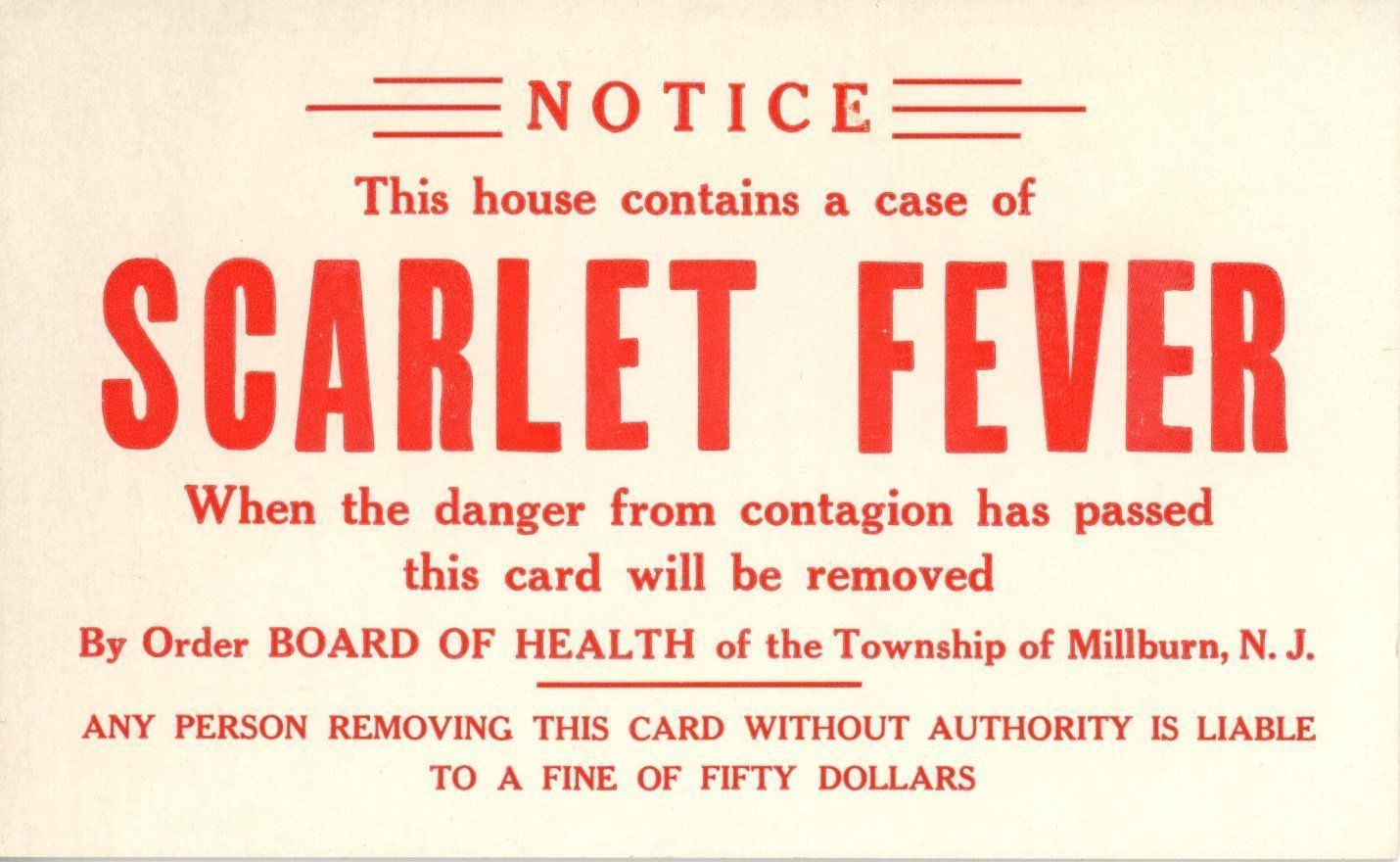 Cardboard notice of diphtheria in household from the Millburn Township Board of Health, c. 1930s. Sign reads: "Notice: This house contains a case of Scarlet Fever. When the danger from contagion has passed this card will be removed. By Order BOARD OF HEALTH of the Township of Millburn, N.J. Any person remoing this card without authority is liable to a fine of fifty dollars."Acquisition