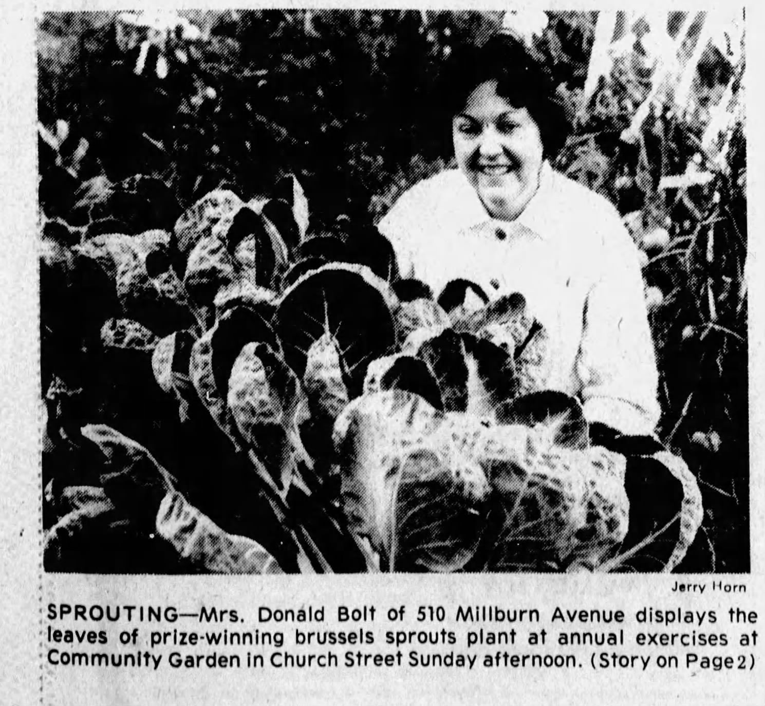 Photograph published in the October 11, 1979 edition of The Item featuring Mrs. Donald Bolt showing off her prize-winning brussels sprouts plant at the Community Garden.Collection